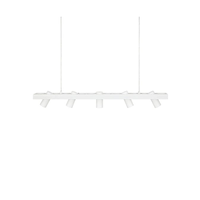 Torino taklampa från Markslöjd med 5 st riktbara lamphuvuden. Hängs upp med takbygel och har 1,5 m lång transparent sladd.