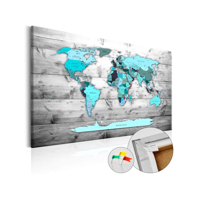 Anslagstavla Arkiio Blue Continents är en produkt för de som söker en unik väggdekor. Tack vare ekologiskt material och vacker design förvandlas den vanliga anslagstavlan till en elegant inredning som du kan använda på många praktiska sätt. Du kan sätta fast dina anteckningar och foton och markera besökta platser på kartan med häftstift.