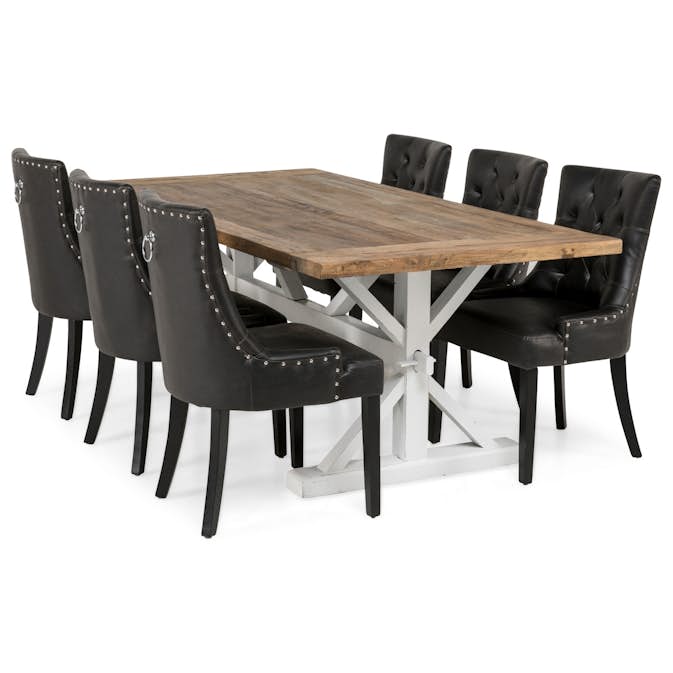 Matgrupp In Living Lyon 200 cm med 6 Tuva Fåtölj är en rustik matgrupp med en stor portion vintage charm. Matbordet är rejält med bordsskiva i vintage almträ och vitt underrede i klassisk stil. Bordet har mindre märken som tillför charm till möbeln och ger matbordet en naturlig look med genuin känsla. Tuva fåtölj är en rejäl matstol med fantastisk sittkomfort och en härlig läderkänsla. Stolen är klädd i svart läderimitation (PU) som ger en mjuk och skön sittyta, samtidigt som det är lätt att torka av vid eventuellt spill. Stolen har en stilren design med knappklädd rygg och svartbetsade ben. Den goda sittkomforten öppnar möjligheter för långlivade middagar med dina vänner.