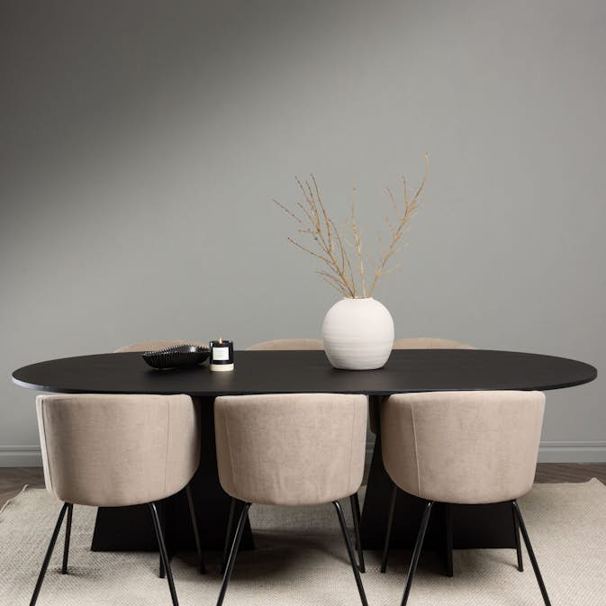 Det blir inte bättre än såhär! Vårt ovala matbord Bootcut har en unik design med en oval bordsskiva i MDF med faner och en säregen stomme med två konformade ben i öppen design. Här tillsammans med våra bekväma matstolar Berit. Stolen har en helklädd design med lätt rundad rygg och sits i sammetstyg och polysterlinne samt smala stolsben i svart järn. Otroligt inbjudande och lyxig matgrupp helt enkelt!