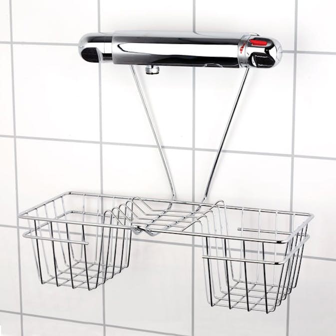 Blandarkorg Arrow 11110 i krom är en trådhylla med svensk kvalitet. Blandarkorgen hängs på dusch- eller badkarsblandaren, passar till både 150 och 160 cc. Blandarkorg Arrow 11110 behöver inga skruvar för montage i väggen.