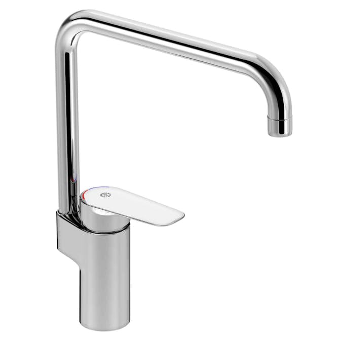 Köksblandare Gustavsberg Atlantic med hög L-pip har cylindriska former och stilren design som passar in i de flesta kök. Pipen är svängbar 110°, spärr för 0° och 60°. Utrustad med soft move, keramiskt paket med mjuk och precis manövrering. Keramisk tätning för droppsäkring och lång livslängd. Justerbar maxtemperatur för ökat skållningsskydd. Alla komponenter i livsmedelsgodkända material. Finns att köpa med eller utan diskmaskinsavstängning. Komplettera med matchande diskho eller diskbänk.