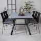 Matgrupp Vyn med ett matbord i svart aluminium och grått glas. Matchas tillsammans med 6 st Julle matstolar med en ram i svart stål och en sits i svart rep. Bord och stol kräver enklare montering.