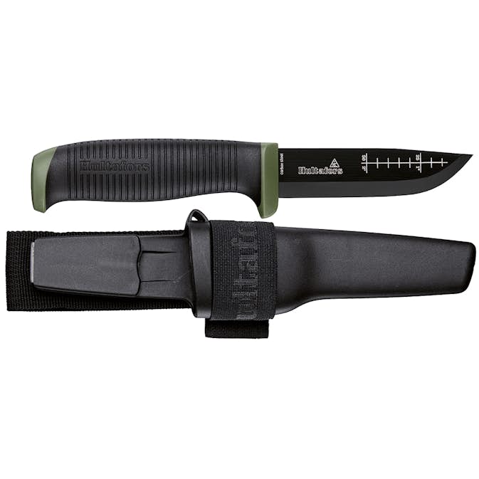 En mångsidig och kraftig friluftskniv med friktionsgrepp som är framtagen för de tuffa uppgifterna. Det kraftiga tyghölstret tillåter upp till 80 mm brett bälte och har avsedd förvaring av tändstål. Bladet som är gjort av 3,0 mm japanskt knivstål har en skandinavisk slipning och härdats till 58-60 HRC.Elektroforetisk ytbehandling (EPD) minskar risken för rost. Skaftet är tillverkat av extra slagtålig PP-plast med friktionsgrepp av Santoprene. En 82 mm lång tånge gör kniven mycket stryktålig. Det kraftiga tyghölstret tillåter upp till 80 mm brett bälte och har en ficka för förvaring av tändstål. Tyghölstret är även avtagbart ifall du vill sätta fast hölstret på knappen i arbetskläder. Slipad rygg på bladet för använding av tändstål samt lasergraverad skala avsedd för friluftsaktiviteter.