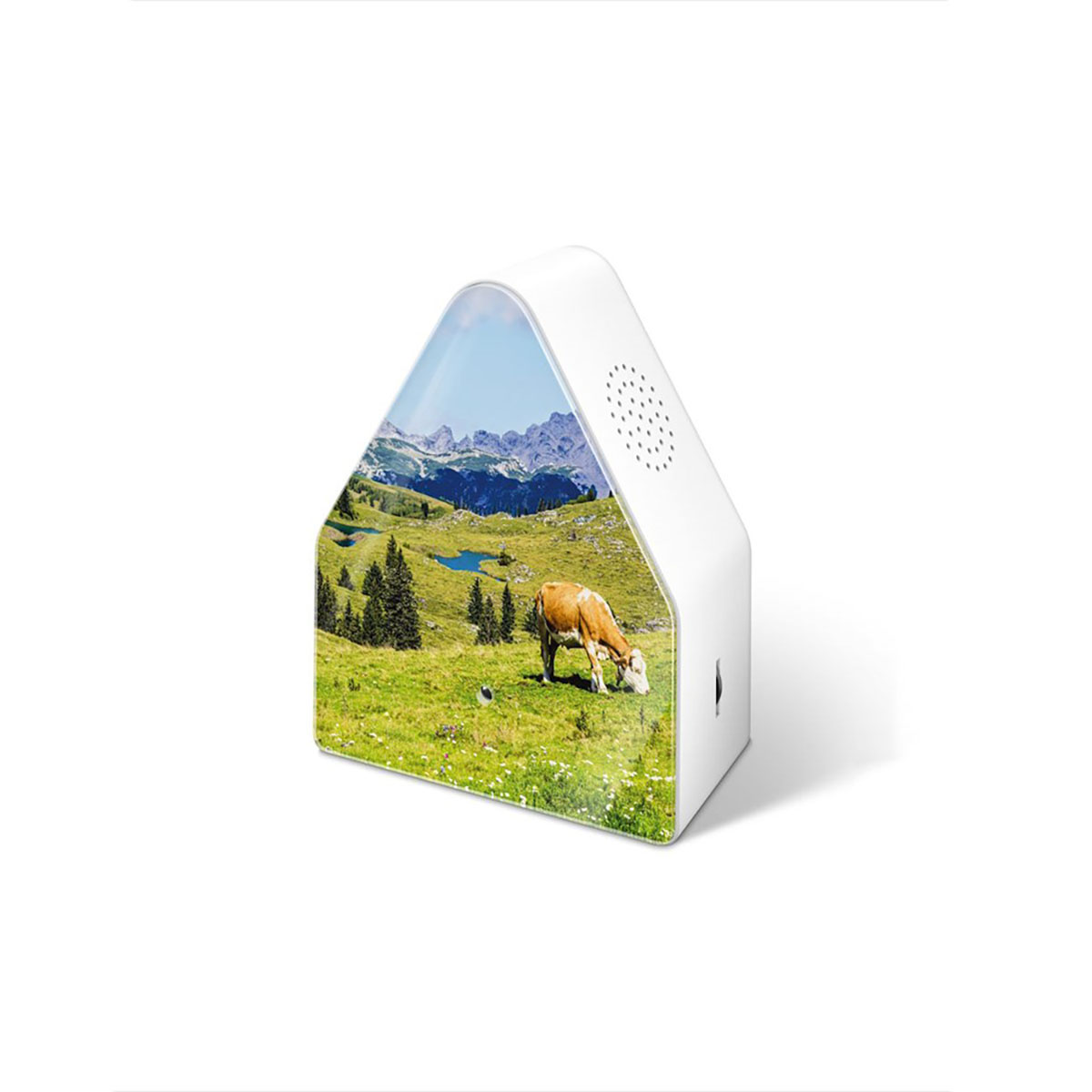 Speldosa med ljud av miljön i alperna. Under tre minuter omges du av imponerande toppar, grönskande bergsängar och den underbart friska bergsluften. Du aktiverar speldosan när du passerar den och om ingen ny impuls följer tonar den ut efter tre minuter. Oavsett om du har den hemma eller på kontoret, i badrummet eller i hallen kan du placera din speldosa var som helst eller hänga upp den på väggen. Perfekt för: barnrum, badrum, gästtoalett, entré, korridor, kontor.