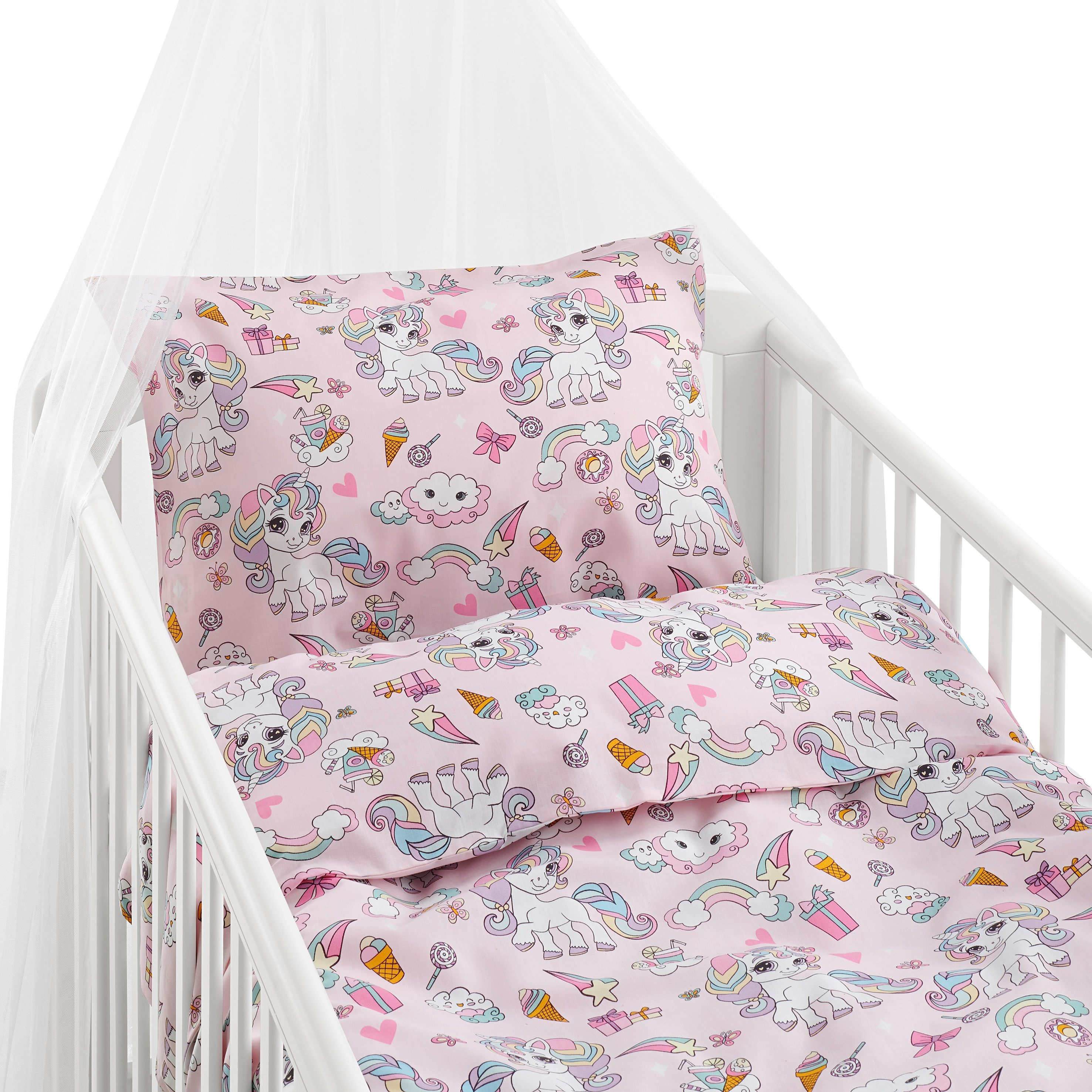 Borganäs bäddset med enhörningsmönster, bestående av ett påslakan (100x130 cm) och ett örngott (38x55 cm), tillverkat av 100% bomull.