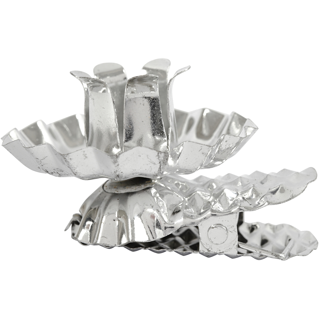 Ljushållare på klämma i metall till julgransljus med en diameter på 12 m.m. Lamellerna som håller fast ljuset, kan ev. pressas lite försiktigt runt ljuset för bättre fixering.