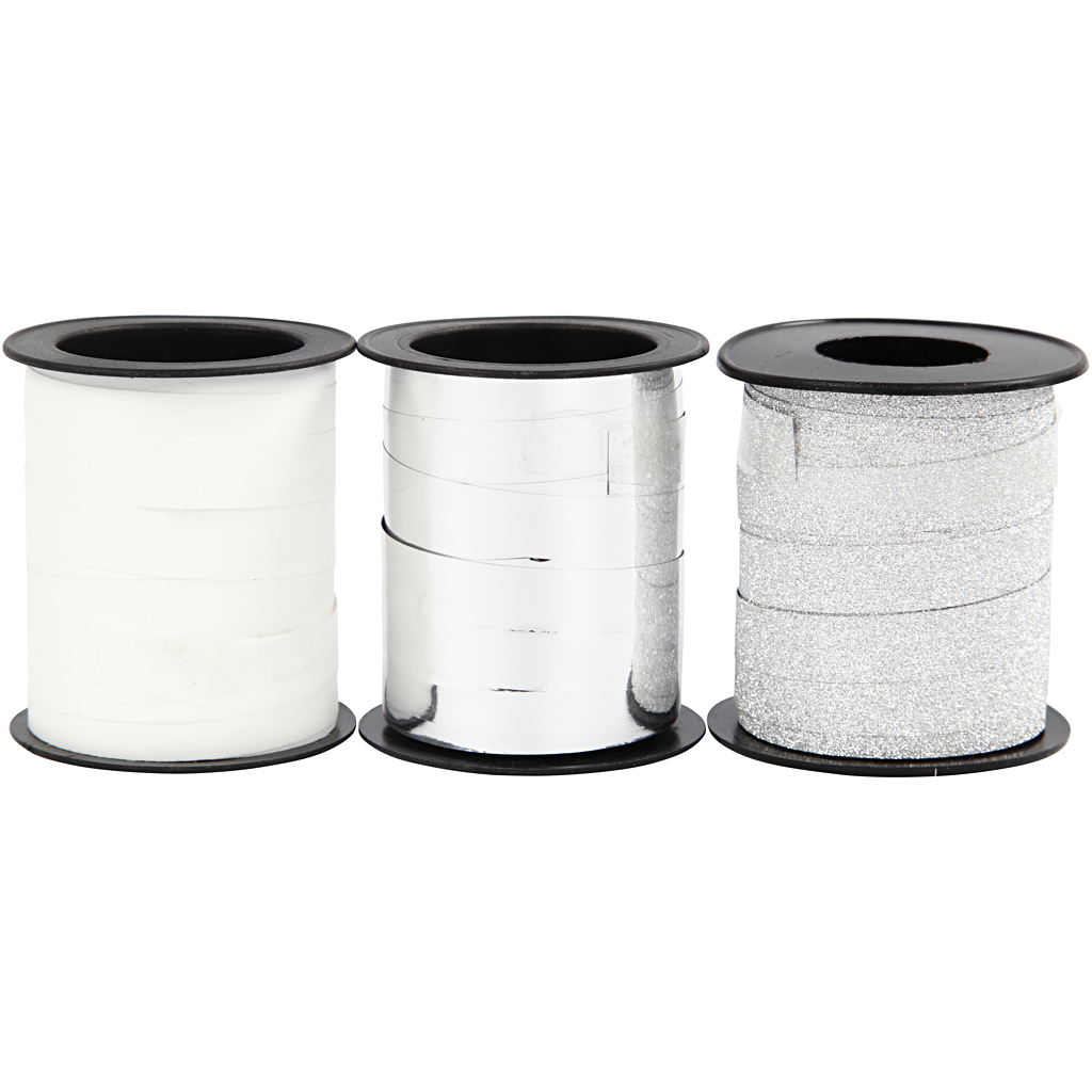 Sortiment av genomfärgat polyband med glitter på den ena sidan. Kan krusas/krullas med sax eller liknande.
