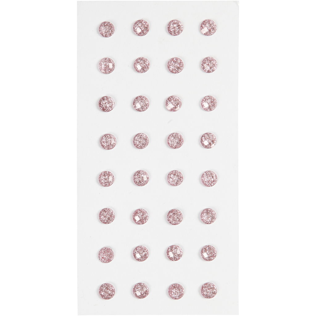 Självhäftande, runda rhinestones med glitteryta.