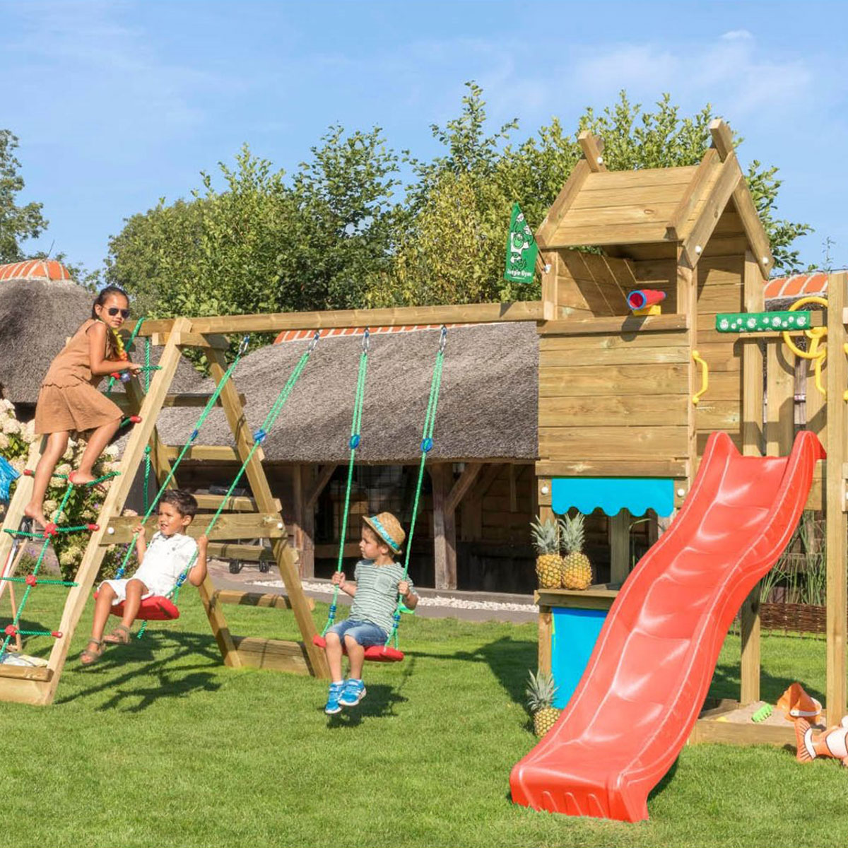 Aloha! The Jungle Resort 2-klättermodul är en högpresterande kombination av modern design med en inbjudande semesterstil. Koppla av i klätterställningens sandlåda, unna dig minimarknaden, umgås med dina nära och kära på lekplatsen, eller för lite mer spänning kan de små semesterfirarna glida ner för rutschkanan. Älskar barnen att gunga och klättra? Då kommer denna multifunktionella design att passa bra.