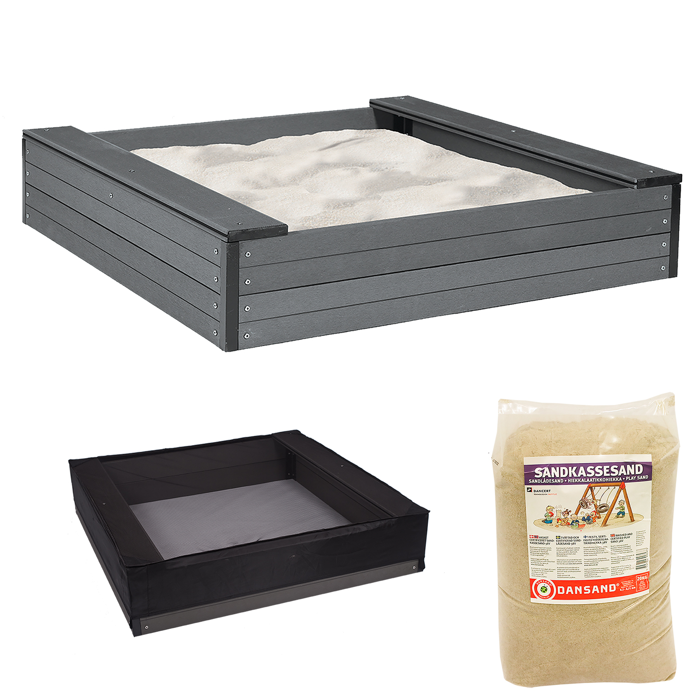 Sandlåda tillverkad av underhållsfri komposit med sittbrädor på varje sida. Levereras omonterad med detaljerad monteringsanvisning och skruvar. Denna Nordic Play-sandlåda levereras omonterad med detaljerad monteringsanvisning. Sanden är uppgrävd, tvättad, silad och packad hos Dansand i Danmark. Miljövänlig och helt utan tillsatser. Du kan därmed låta dina barn leka i sandlådan med gott samvete.
