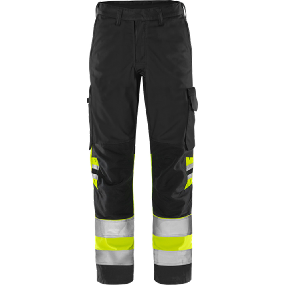 Varselbyxa Green 2649 GPLU, klass 1. Återvunnen polyester och ekologisk bomull / Miljödeklarerad (EPD) / Ribbstickade stretchpartier i midjan / Dold knapp fram / 2 framfickor / 2 bakfickor / Dubbel förstärkt grensöm / Hammarhank / CORDURA®-förstärkt tumstocksficka med verktygsficka, pennficka samt knapp och hälla för kniv / Benficka med tryckknapp, ficka med lock och kardborrelås samt D-ring / Knäfickor i CORDURA® med öppning inifrån / Knäskydden i knäfickorna kan höjdjusteras / CORDURA®-förstärkning i benslut / Benlängden kan förlängas 5 cm / Benlängden kan förkortas 4 cm i C44-C70, C146-C160 och 2 cm i D84-D136 / Godkänd enligt EN ISO 20471 klass 1, EN 14404 tillsammans med knäskydd 124292 och EN 13758-2 UPF 40+ UV-skydd / Godkänd efter 50 tvättar / Testad för industritvätt enligt ISO 15797 / EPD reg.nr 3881 på environdec.com / OEKO-TEX®-certifierad.