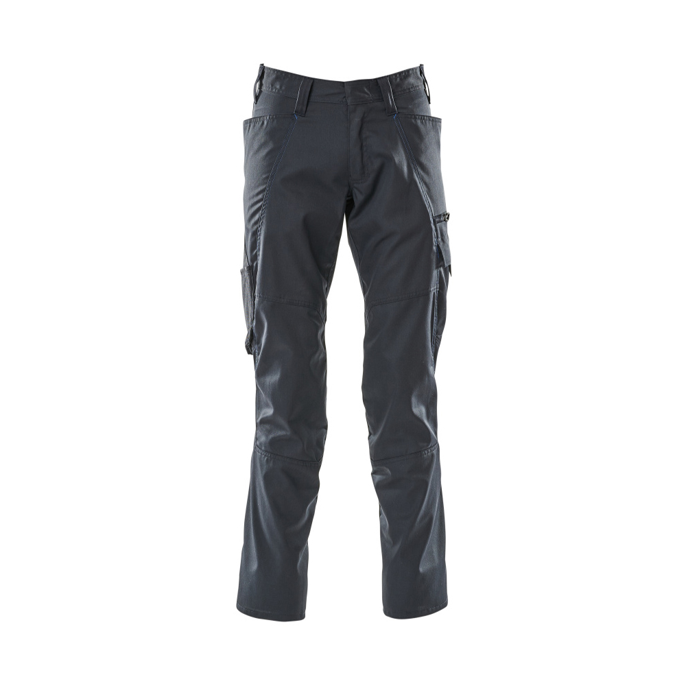 Enfärgade. Lätt kvalitet. Tvånålsstickningar på benen och i grenen. Låg midja och formskuren linning. Byxbenen är ergonomiskt formade. Bältesstroppar. Gylf med blixtlås. Fickor på framstycket. Bakfickor. Benficka med telefonficka och lock med dold tryckknapp och inbyggd ID-korthållare. ID-kortshållaren är avtagbar. Tumstocksfickan är CORDURA®-förstärkt. Med tryck och reflexer.