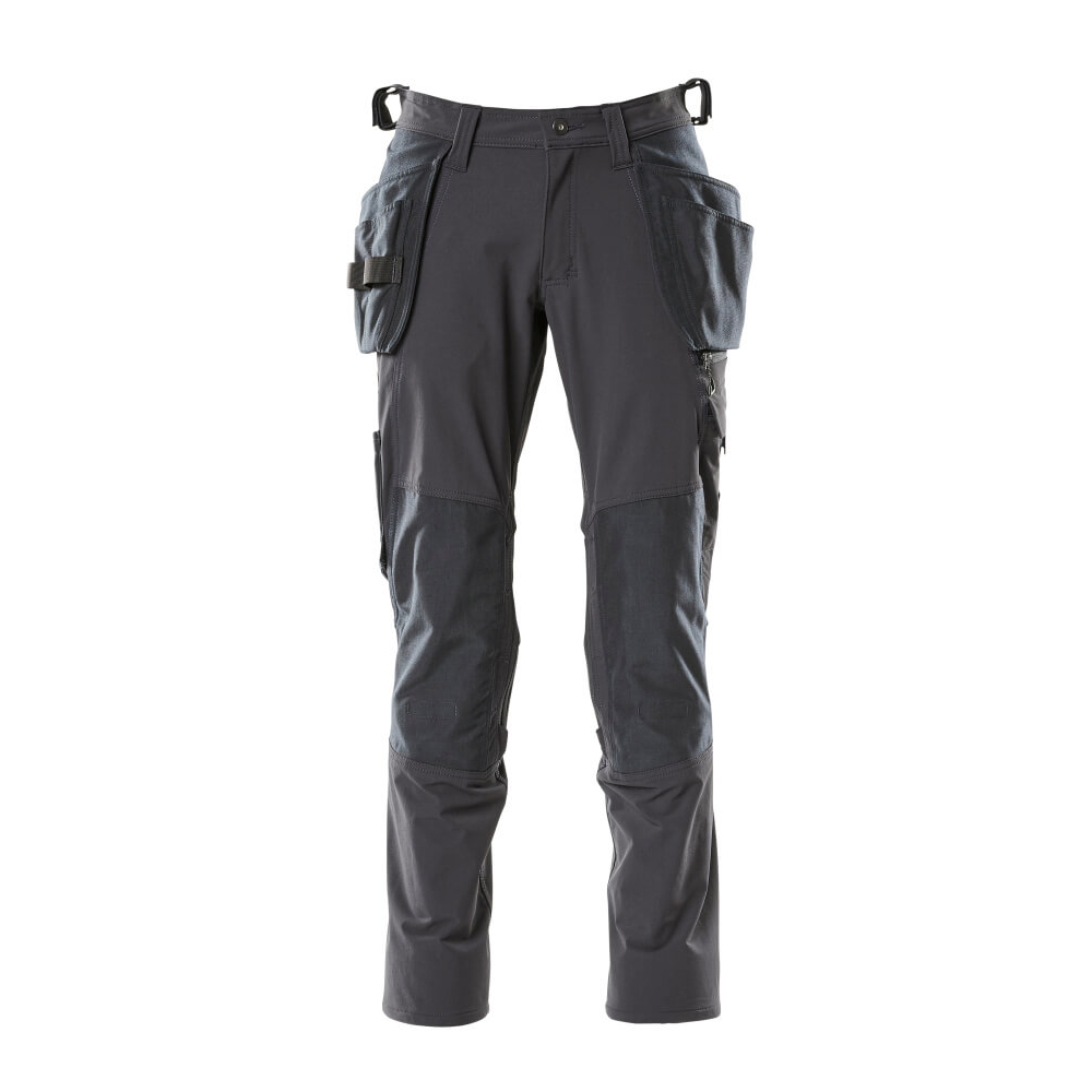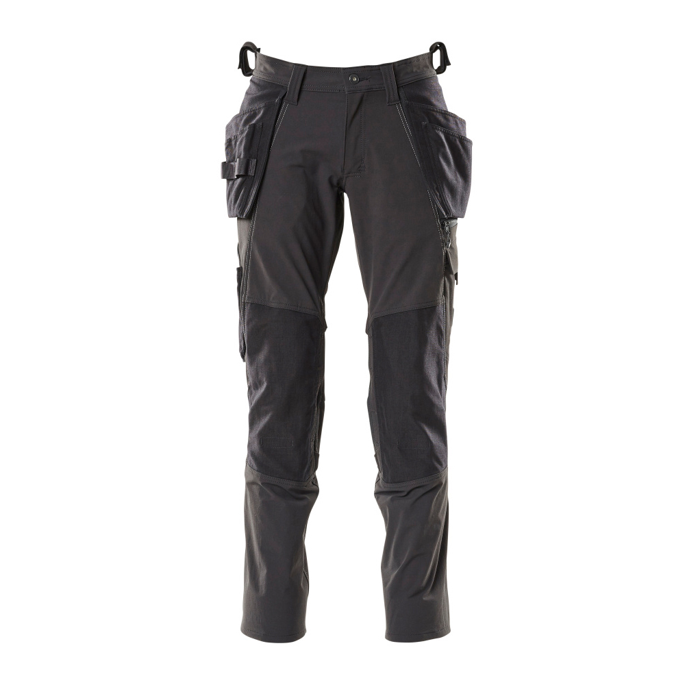 Stretchtyget är elastiskt åt alla håll, vilket ger en unik rörelsefrihet, där inget stramar eller irriterar. Det multifunktionella stretchtyget kombinerar låg vikt med mycket hög slitstyrka, samtidigt som det är vattenavvisande. Hängfickor i slitstark CORDURA®. Knäfickorna i slitstarkt CORDURA® är reglerbara, så att knäskydden får den optimala placeringen. Effektiv ventilation vid knäområdet via blixtlås på sidan av benet. Extra synlig för omgivningarna med hjälp av reflexeffekter. Samcertifierade för användning med MASCOT:s knäskyddstyp SHORT eller LONG, eftersom knäskyddsfickan kan höjdjusteras.