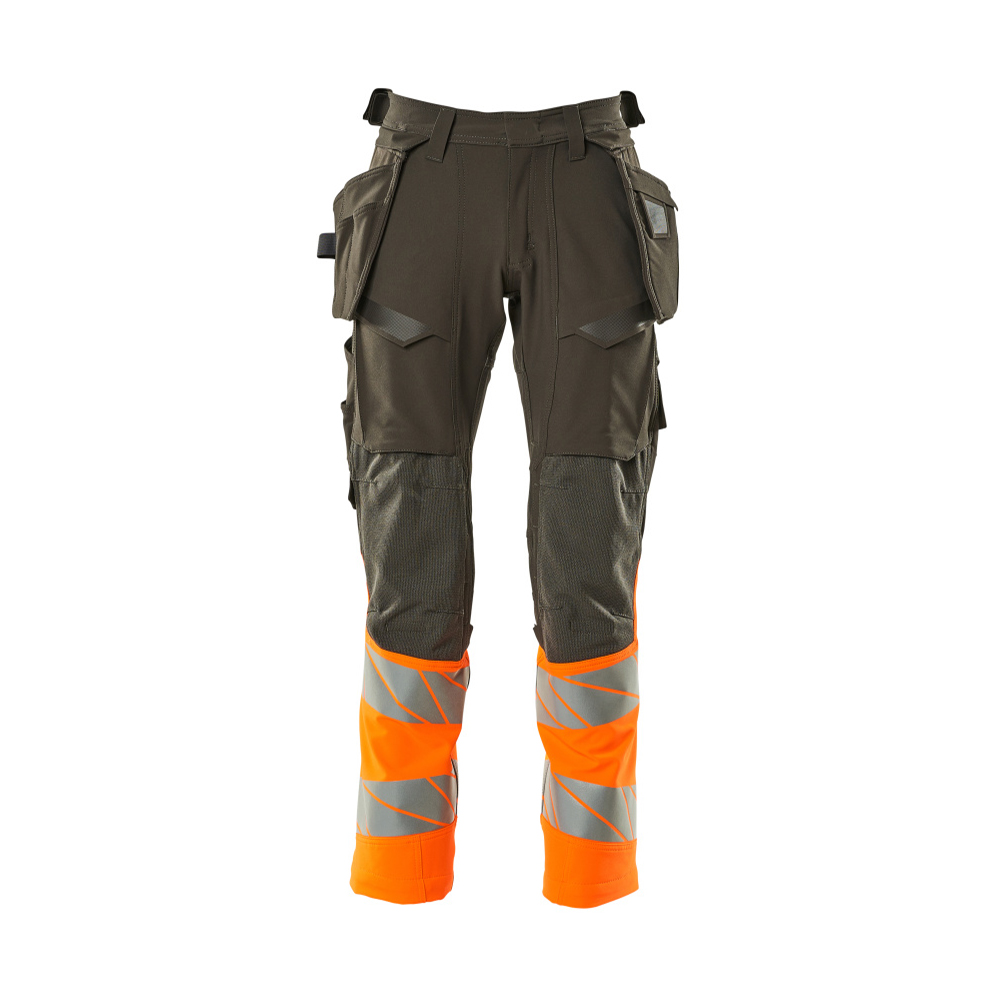 Fluorescerande kontrastfärg och med reflexer. Har en vattenavvisande yta. Tvåfärgat. Ultimate stretchtyg med låg vikt och bra slitstyrka. Tvånålsstickningar på benen och i grenen. Låg midja. Knäppningen är dold. Byxbenen är ergonomiskt formade. Avtagbara hängfickor. Stängning med tryckknapp på den innersta hängfickan. Hängficka med fodrad telefonficka och magnetstängning. Hängfickor med Kevlar® och CORDURA®-förstärkningar. Bältesstroppar. Verktygsstropp på båda sidor av linningen. Gylf med blixtlås. Fickor på framstycket. Bakfickor med förstärkningar och lock. Dold hammarögla i båda sidorna. Knapp (avtagbar) för montering av knivhållare. Tumstocksfickor med Kevlar®-förstärkningar. Fickor med lock på framsidan av låret. Knäfickor i CORDURA® tvåvägs stretchtyg med ventilation. Enkel individuell justering av knäficka höjd. Benficka med fodrad telefonficka, magnetstängning och inbyggd ID-kortshållare. ID-kortshållaren är avtagbar. Lodrätt blixtlås med möjlighet för ventilation på baksidan av låret. Med tryckeffekter. Innerbenslängden kan ökas med 3 cm genom att ta bort den invändiga röda sömmen vid foten. Vi rekommenderar 00718-100, 00418-100, 50454-916 & 20118-915 knäskydd till den här modellen. Samcertifierade med knäskyddstyp SHORT eller LONG enligt EN 14404.