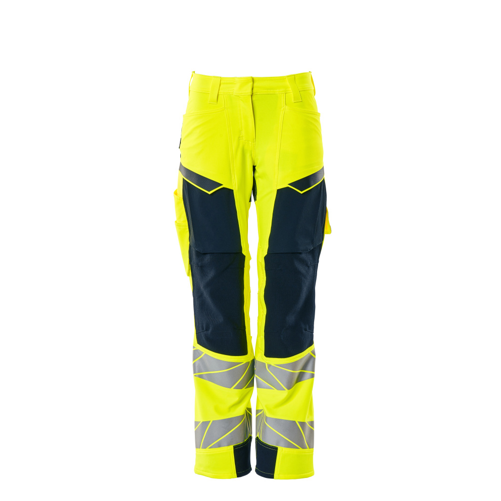 Lady passform DIAMOND. Fluorescerande och med reflexer. Har en vattenavvisande yta. Tvåfärgat. Ultimate stretchtyg med låg vikt och bra slitstyrka. Tvånålsstickningar på benen och i grenen. Låg midja. Knäppningen är dold. Byxbenen är ergonomiskt formade. Bältesstroppar. Stängning med blixtlås. Fickor på framstycket. Bakfickor med förstärkningar. Dold hammarögla i höger sida. Förberedd för hängfickor 19450-126 som sätts fast med knappar. Tumstocksfickor med Kevlar®-förstärkningar. Fickor med lock på framsidan av låret. Justerbara knäfickor i mycket slitstark CORDURA® (1000 D). Enkel individuell justering av knäficka höjd. Benficka med fodrad telefonficka, dold stängning med tryckknapp och inbyggd ID-kortshållare. ID-kortshållaren är avtagbar. Lodrätt blixtlås med möjlighet för ventilation på baksidan av låret. Med tryckeffekter. Innerbenslängden kan ökas med 3 cm genom att ta bort den invändiga röda sömmen vid foten. Vi rekommenderar 00718-100, 00418-100, 50454-916 & 20118-915 knäskydd till den här modellen. Samcertifierade med knäskyddstyp SHORT eller LONG enligt EN 14404.