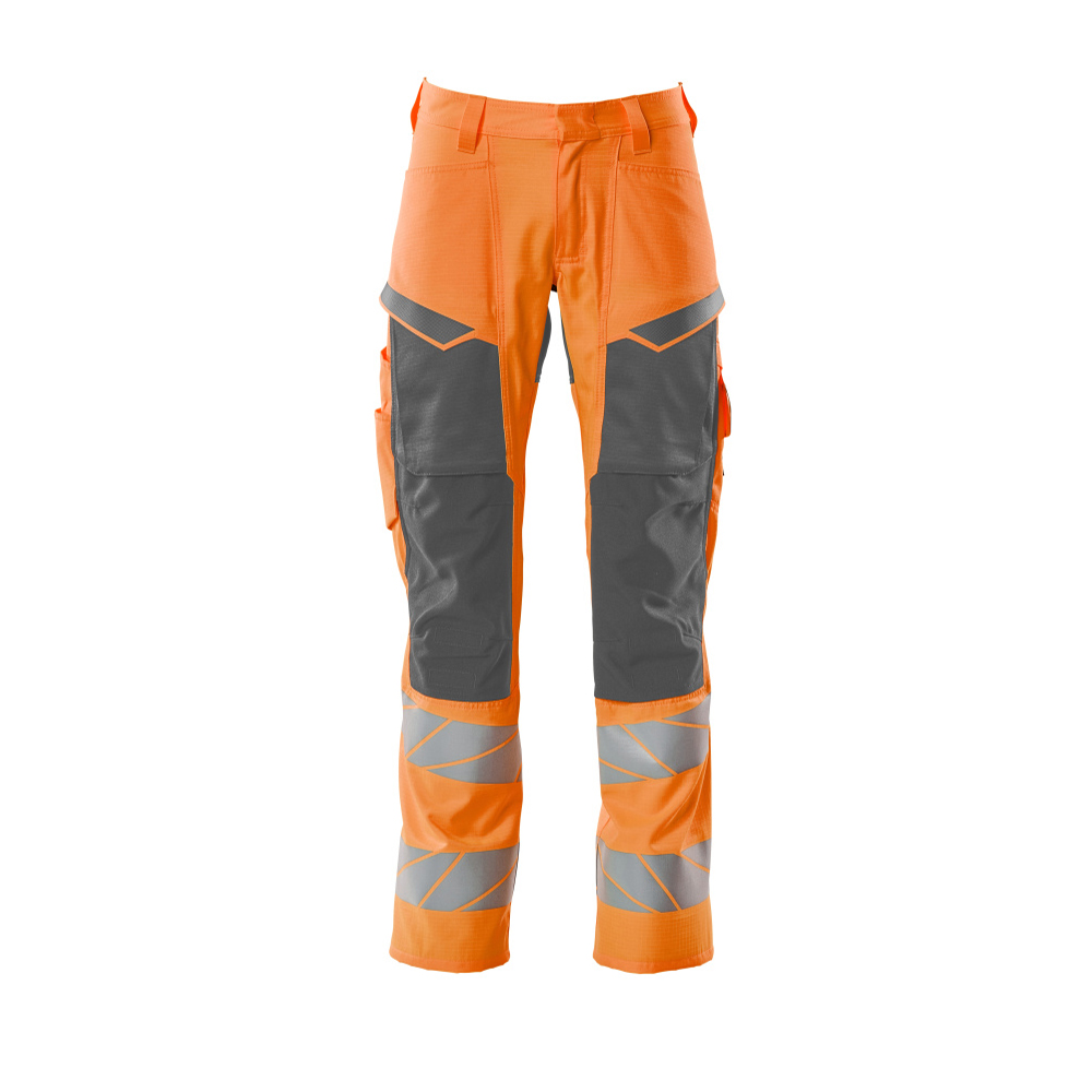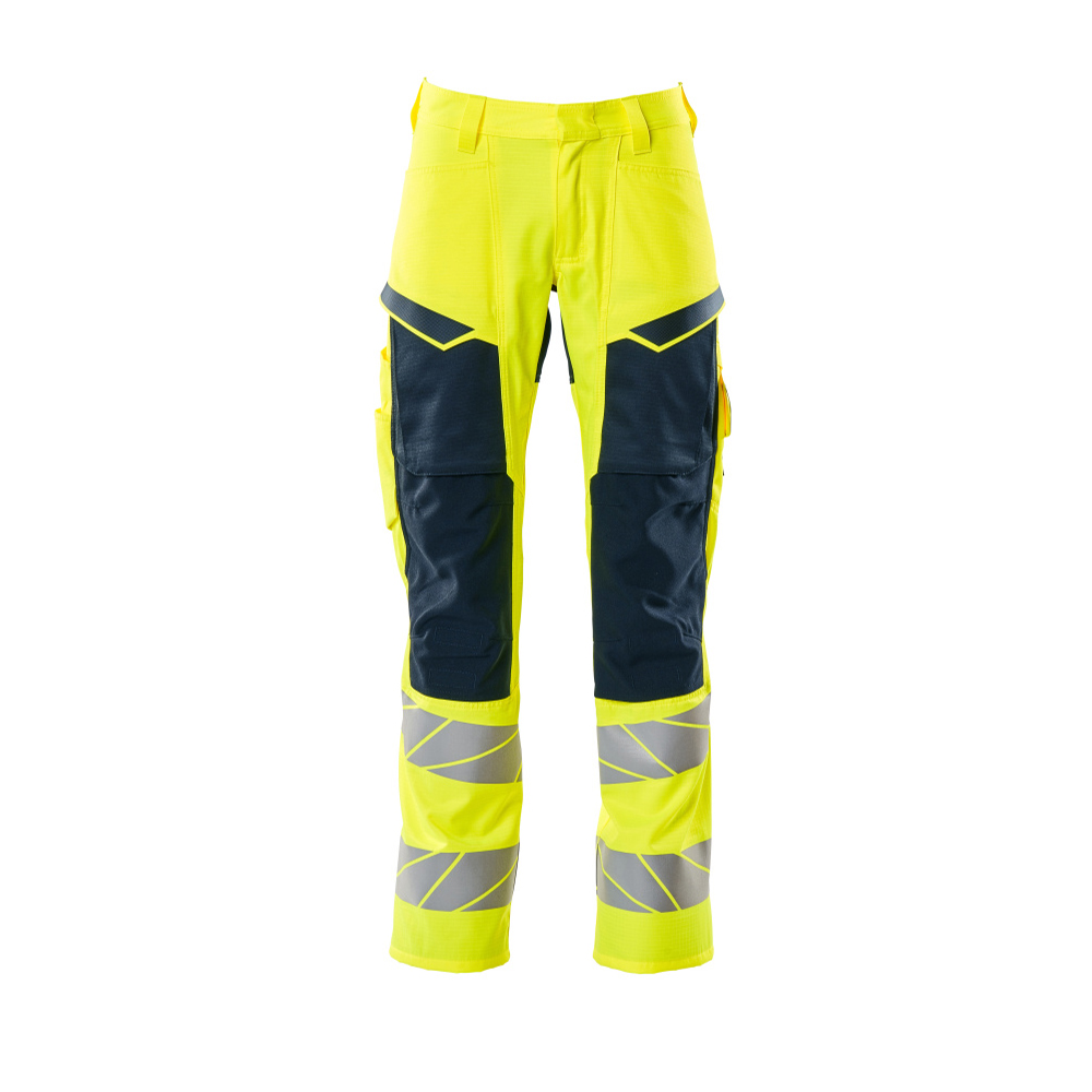 Fluorescerande och med reflexer. Tvåfärgat. Delar av produkten är av stretchtyg. Kombination av lättviktigt tyg kvalitet 236 och ULTIMATE STRETCH kvalitet 511. Tvånålsstickningar på benen och i grenen. Låg midja. Knäppningen är dold. Byxbenen är ergonomiskt formade. Bältesstroppar. D-ring. Gylf med blixtlås. Fickor på framstycket. Bakfickor med förstärkningar. Hammarstroppen är justerbar. Tumstocksfickan är förstärkt. Fickor med lock på framsidan av låret. Justerbara knäfickor i slitstark CORDURA® (500 D). Enkel individuell justering av knäficka höjd. Benficka med telefonficka och lock med dolda tryckknappar. Med tryckeffekter. Förberedd för hängfickor 19450-126 som sätts fast med knappar. Innerbenslängden kan ökas med 3 cm genom att ta bort den invändiga röda sömmen vid foten. Vi rekommenderar 00718-100, 00418-100, 50454-916 & 20118-915 knäskydd till den här modellen. Samcertifierade med knäskyddstyp SHORT eller LONG enligt EN 14404.