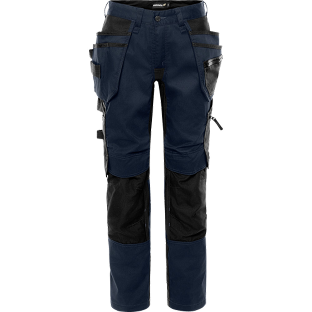 Hantverkarbyxa stretch 2901 GWM, dam. Delvis återvunnet material / Mekanisk stretch / Stora partier med 4-vägsstretch bak och i grenen / 2 löst hängande spikfickor, helfodrade med extra slitstarkt material – den ena med 3 mindre fickor och verktygshällor, den andra med 2 fickor varav en med dragkedja / 2 framfickor / 2 bakfickor av extra slitstarkt material / Extra hällor för t ex id-kort vid linningen / Dubbel förstärkt grensöm / Hammarhank / Tumstocksficka av extra slitstarkt material med pennficka samt knapp och hälla för kniv / Rymlig benficka av extra slitstarkt material som även kan användas för tumstock, extra ficka med dragkedja / Knäfickor i CORDURA® med öppning utifrån, uppifrån / Knäskydden i knäfickorna kan höjdjusteras / Benslut förstärkta med extra slitstarkt material / Extra benupplägg, kan förlängas 5 cm / Reflexdetaljer på bakbenen / Godkänd enligt EN 14404 tillsammans med knäskydd 124292 / OEKO-TEX®-certifierad.