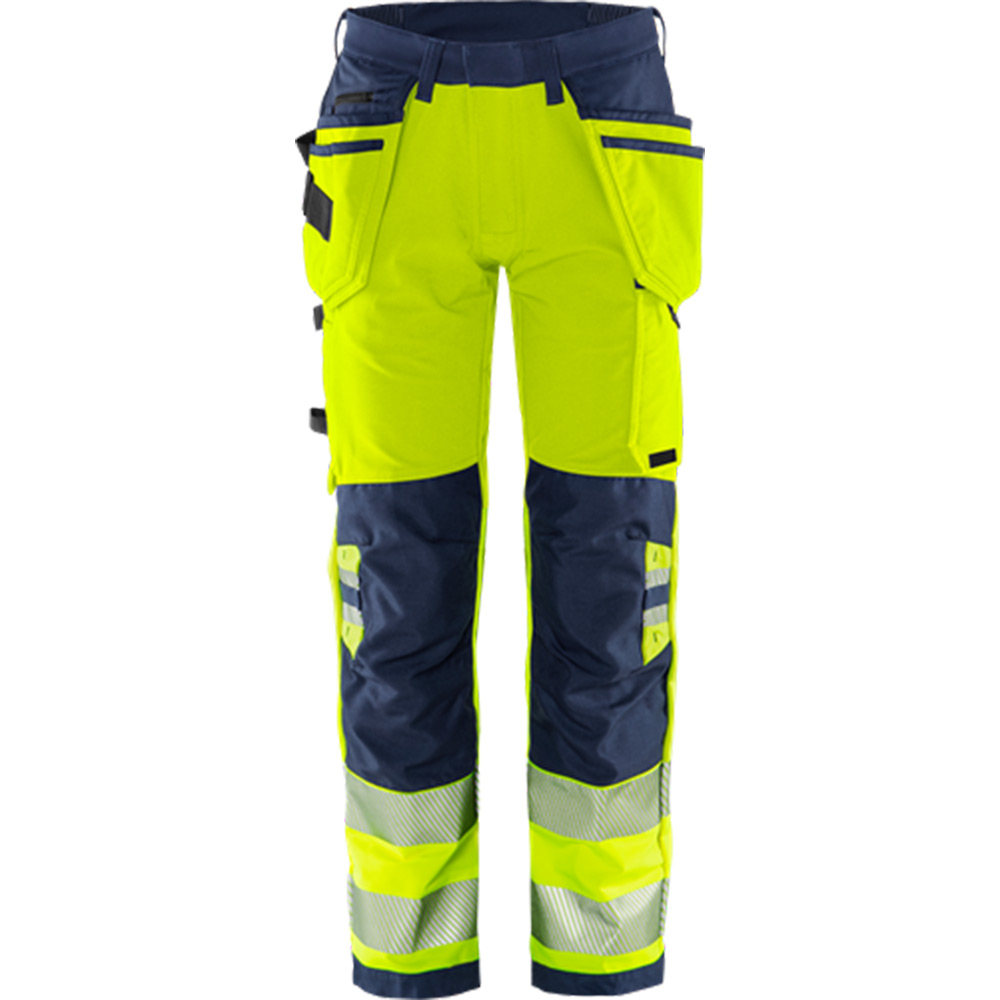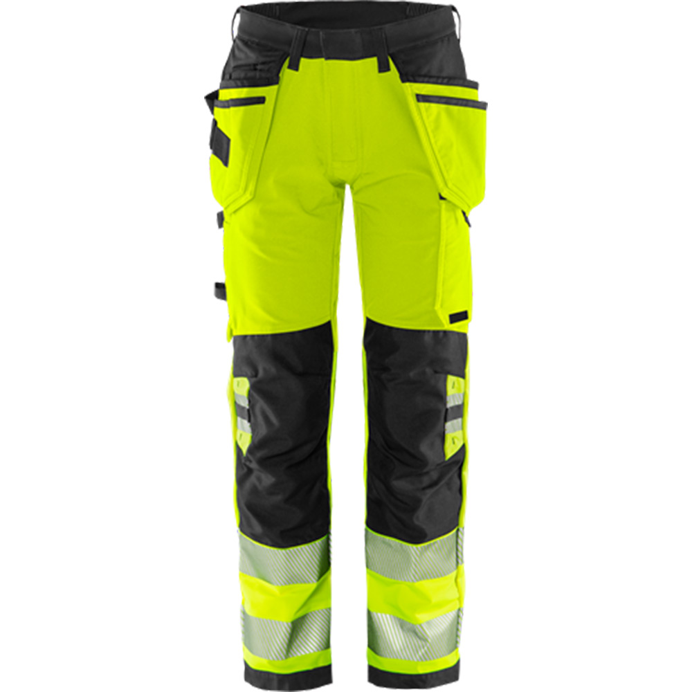 Varsel Green hantverkarbyxa stretch 2644 GSTP, klass 2. Delvis biobaserat och återvunnet material / Miljödeklarerad (EPD) / 4-vägs stretchmaterial / Ribbstickade stretchpartier i midjan / Slitstarkt ripstop-material med 4-vägsstretch på stuss och baksida lår / Dold knapp fram / 2 löst hängande CORDURA®-förstärkta spikfickor – den ena med ficka med dragkedja, 3 mindre fickor och verktygshällor, den andra med extra ficka / D-ring under spikfickan / 2 framfickor / 2 bakfickor med lös botten, varav en med dragkedja / Dubbel förstärkt grensöm / Hammarhank / CORDURA®-förstärkt tumstocksficka med verktygsficka, pennficka samt knapp och hälla för kniv / Benficka med tryckknapp, ficka med dragkedja och D-ring / Knäfickor i CORDURA® med öppning inifrån / Knäskydden i knäfickorna kan höjdjusteras / CORDURA®-förstärkt benslut / Dold kängkrok / Godkänd enligt EN ISO 20471 klass 2, EN 14404 tillsammans med knäskydd 124292 och EN 13758-2 UPF 40+ UV-skydd / Färg 271 godkänd enligt RIS-3279-TOM för brittisk järnväg / Godkänd efter 50 tvättar / EPD reg.nr 3887 på environdec.com / OEKO-TEX®-certifierad.