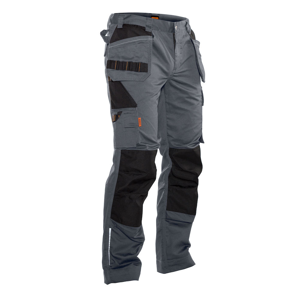 Lättskött polyester/bomull som håller färg och form. Hölsterfickor med extra fack och extra ficka med blixtlås. Bakfickor med lock och kardborrestängning. Benficka med extra fack och lock med kardborrestängning. Tumstocksficka med knivhållare. Förstärkning i hölsterfickor och på knäskyddsfickor. C42-64 kan förlängas med 5 cm genom ett utvik i benslutet.