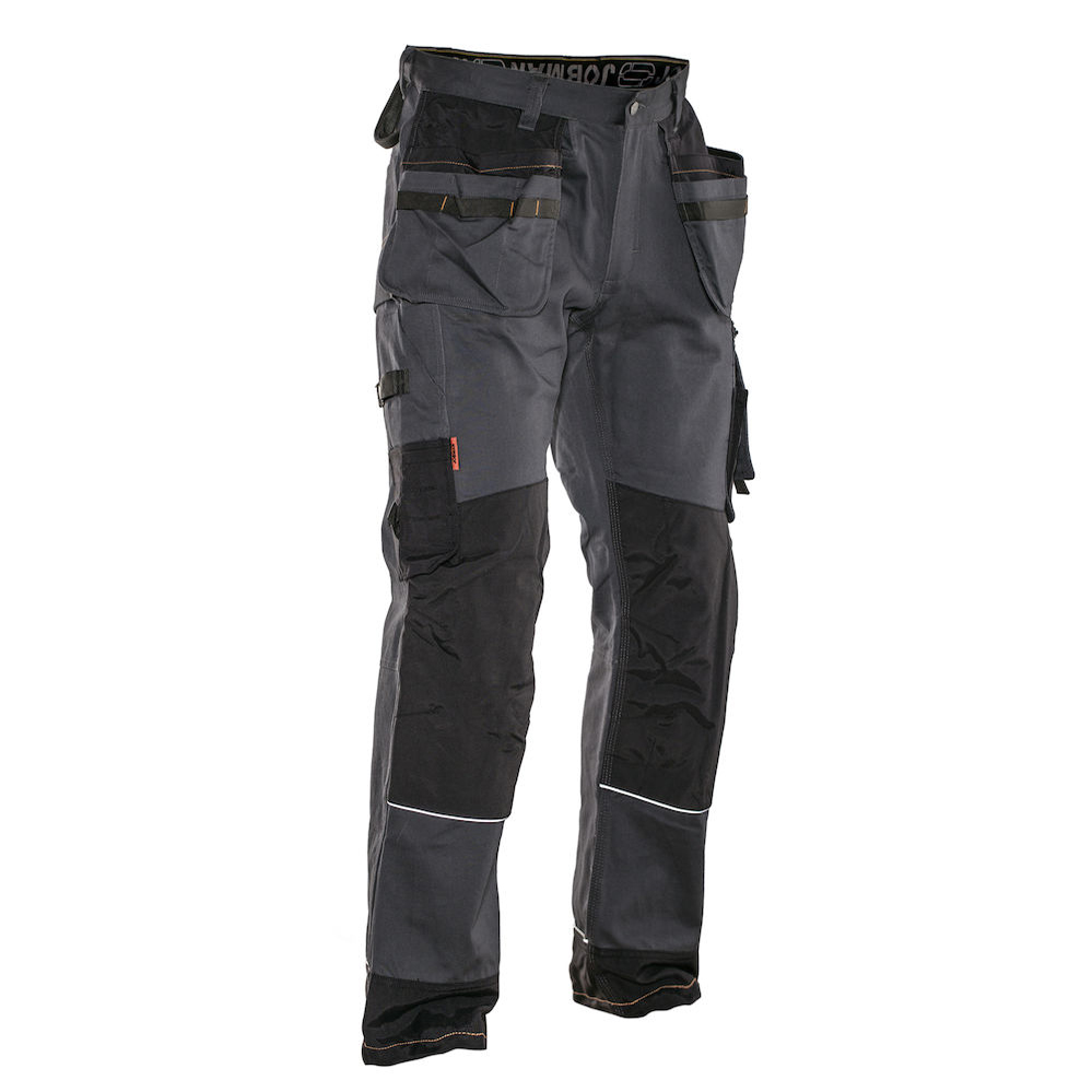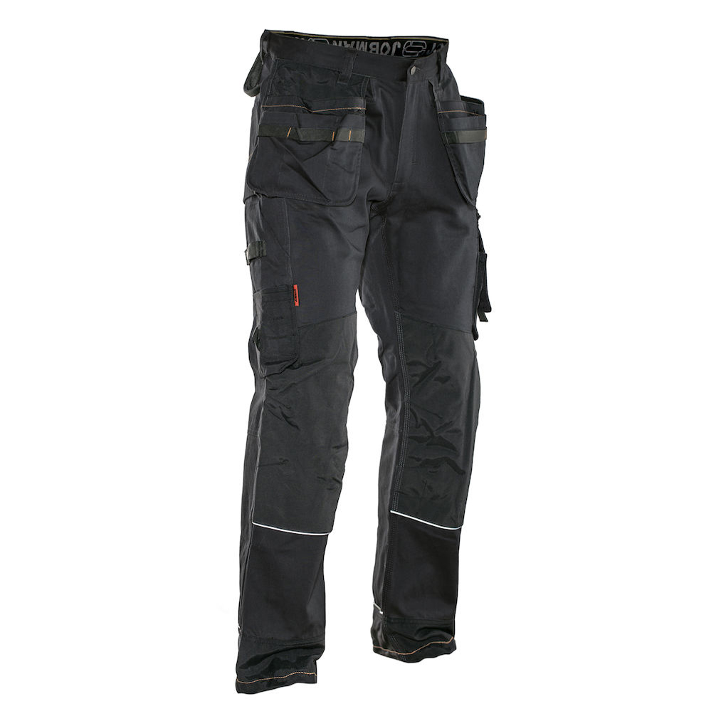 Förstärkta detaljer som hölsterfickor, bakfickor och tumstocksficka. Rymliga hölsterfickor som kan stoppas ned i framfickorna. Rymliga framfickor. Bakfickor med förstärkt insida. Hammarhank. Extra hällor för bältet på de största storlekarna. Tumstocksficka med knivhållare. Benficka med blixtlås, telefonfack, ID-kortshållare och extrafack. Förböjda knän för optimal passform. Knäskyddsfickor i slitstark polyamid med reflexpasspoaler och två höjdnivåer för knäskydden. Förstärkt benslut i polyamid som inte absorberar fukt. Reflexpasspoal och dragsko i benslutet.