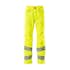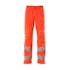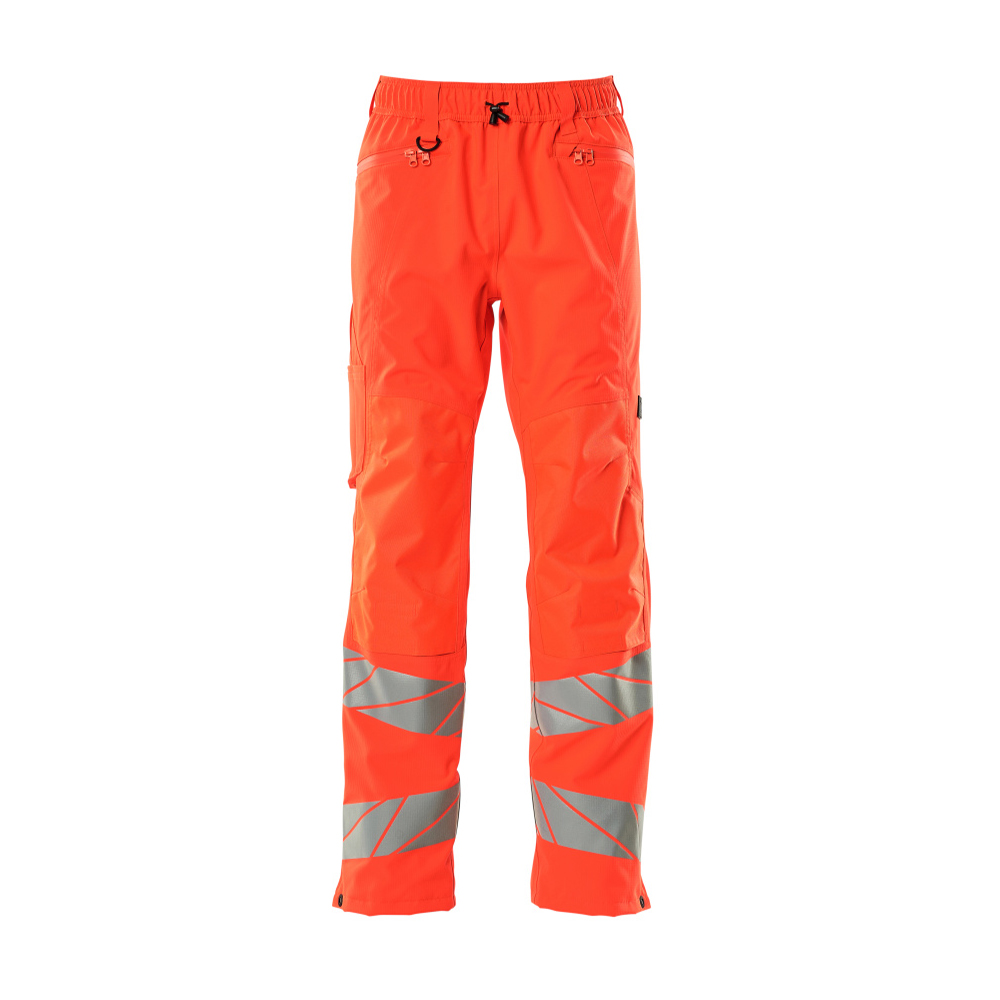 Fluorescerande och med reflexer. Metervara med hög slitstyrka, andas, vind- och vattentät. Sömmarna är tejpade. Byxbenen är ergonomiskt formade. Bältesstroppar. Resår och snörning i midjan. Tumstocksficka. Dragkedja på benens utsida. Samcertifierade med knäskyddstyp SHORT eller LONG enligt EN 14404.