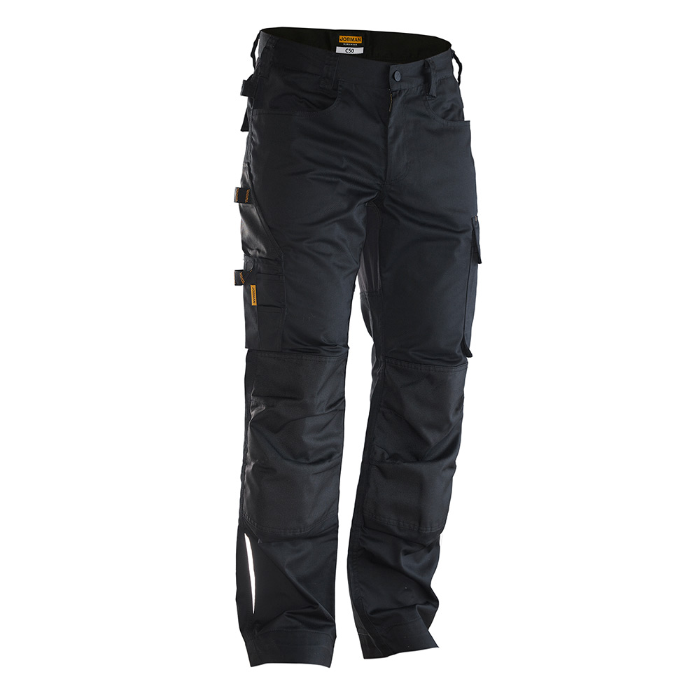 2324 Servicebyxa Stretch. Lättskött polyester/bomull som håller färg och form. Stretchpaneler på bakstycket, för ökad rörlighet. Rymliga framfickor. Bakfickor med lock. Benficka med extra fack och ficklock med kardborrestängning. Tumstocksficka med knivhållare. Förstärkning på knäskyddsfickor och med två höjdnivåer för knäskydd. Byxbenet kan förlängas med 5 cm genom ett utvik i benslutet. Certifierad enligt EN 14404:2004+A1:2010 Typ 2 Nivå 0 tillsammans med Jobmans knäskydd 9941.