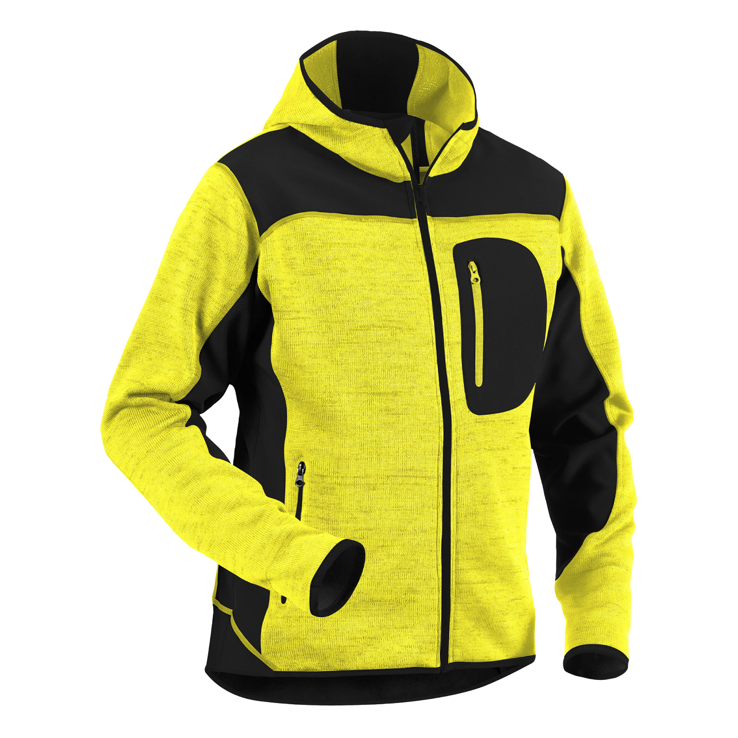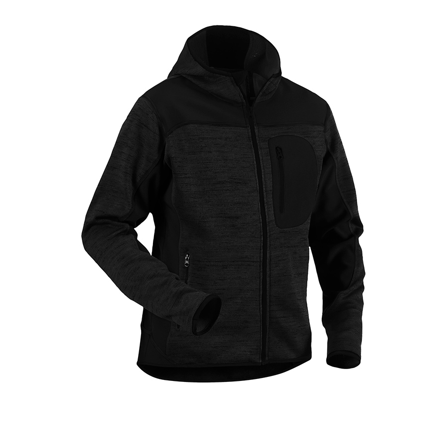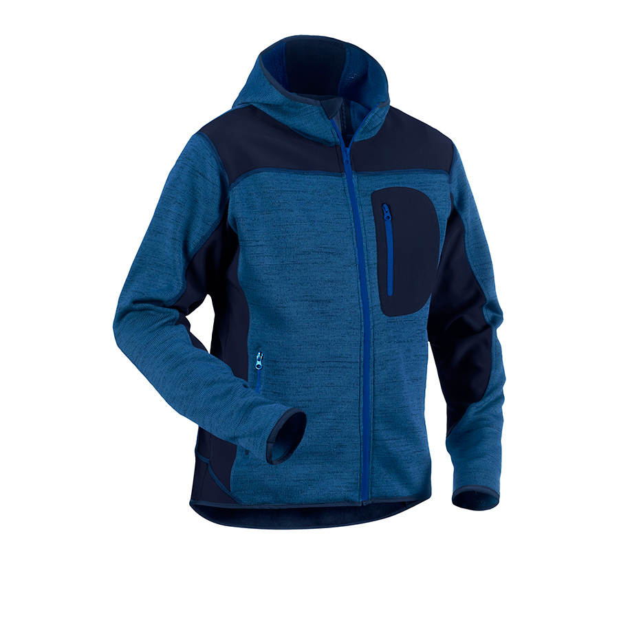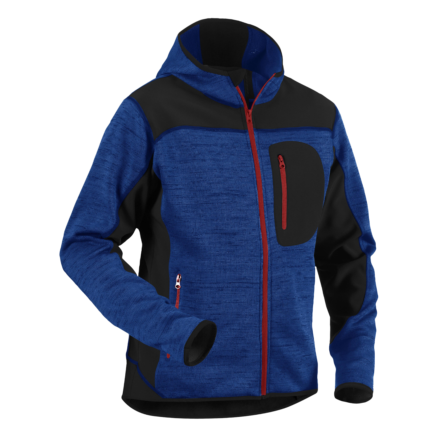 Stickad jacka med luva från Blåkläder i snygg design och bekväm kvalitet. Jackan har dragkedjor i kontrastfärg och är förstärkt med softshellmaterial på axlar och ryggslut för ökad slitstyrka. Fritid som arbete, detta är jackan att trivas i.