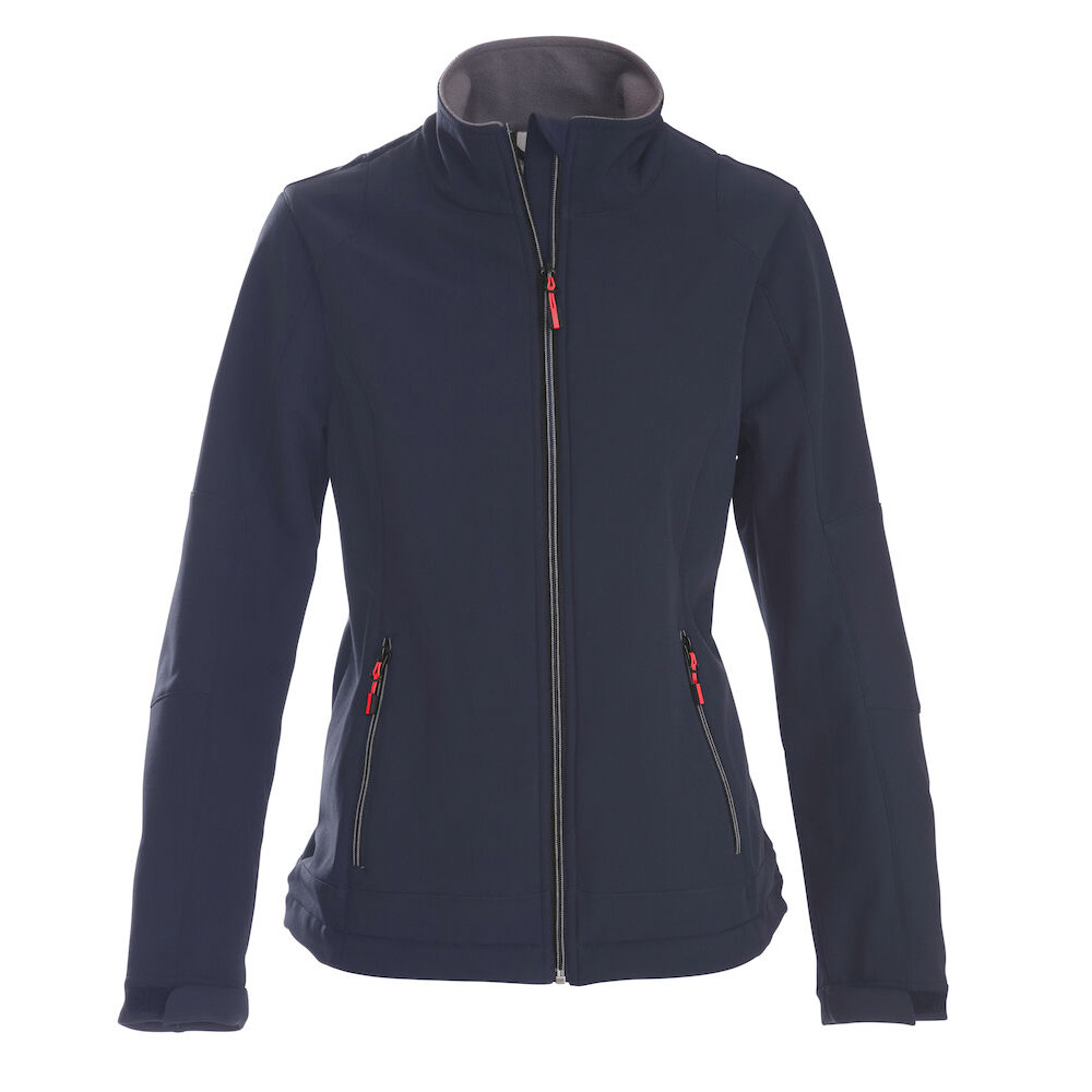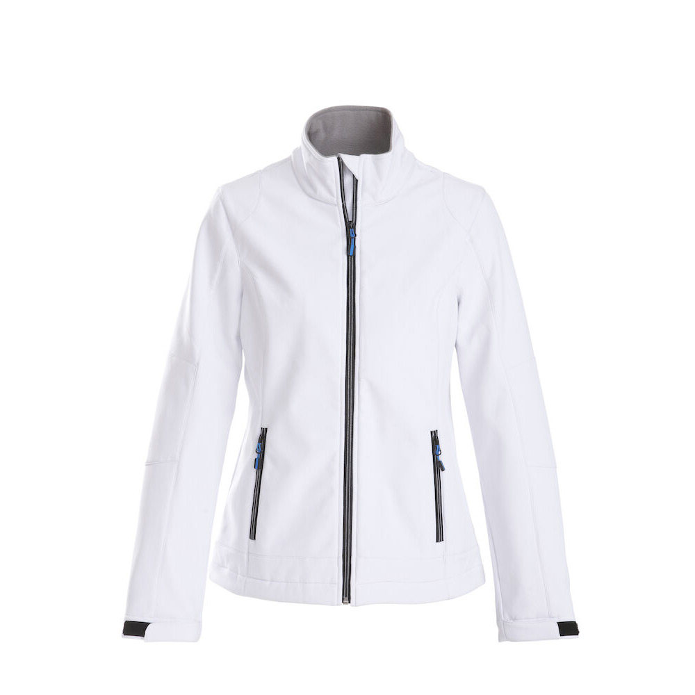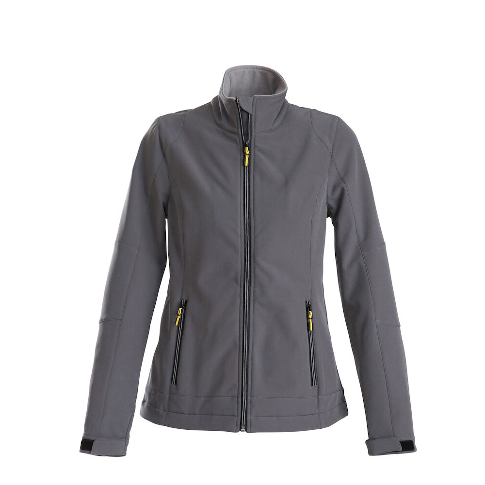 Softshelljacka dam i bondat material med stretch. Tvåfärgad dragkedja framtill och på fickor. Justerbara ärmavslut och dragsko nedtill. Feminin passform. Möjligt att köpa till dragkläppar i andra färgställningar som matchar kundens företagslogga.
