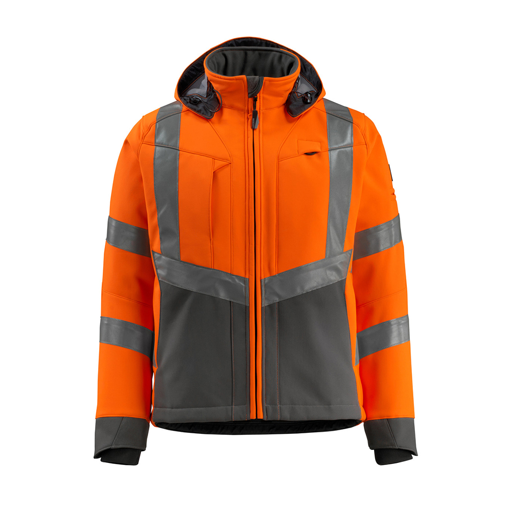 Fluorescerande med lodräta och sneda tvärgående reflexer. Tvåfärgat. Andas, vindtät och vattenavvisande. Fleece på insidan. Stängning med blixtlås och invändigt vindfång. Huvan är avtagbar, fodret har justerbart resårsnöre. Hög krage. Innerfickor. Innerficka med blixtlås som är särskilt utformad för telefoner, med hål till kabel och headset och öglor för att hålla kabeln på plats. Ryggen är förlängd. Bröstficka med blixtlås. D-ring. Pennficka. Ergonomiskt utformade ärmar ger god rörelsefrihet. Ribbstickning vid handleden (dold i vindskyddet). Manschetter med CORDURA®-förstärkning och kardborreband. Framfickor med blixtlås.
