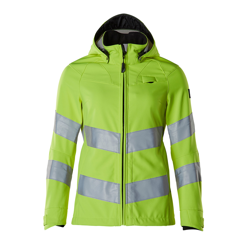 Lady passform. Fluorescerande med sneda tvärgående reflexer. Enfärgade. Andas, vindtät och vattenavvisande. Fleece på insidan. Stängning med blixtlås och invändigt vindfång. Huvan är avtagbar, fodret har justerbart resårsnöre. Hög krage. Innerfickor. Ryggen är förlängd. D-ring. Ergonomiskt utformade ärmar ger god rörelsefrihet. Framfickor med blixtlås. Ribbstickning vid handleden (dold i vindskyddet) med kardborrejustering.
