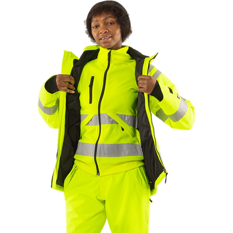 Varsel vinterjacka 4683 GLPS klass 3, dam. Delvis återvunnet material / Mekanisk stretch / Vatten- och vindtät med andasfunktion / Tejpade sömmar / Quiltfoder / Avtagbar och reglerbar huva med förstärkt framkant / Fleecefodrad krage / Vattenavvisande tvåvägs dragkedja ända upp i kragen med invändig slå / Bröstficka med dold vertikal dragkedja och invändig hälla för id-kortshållare / Fleecefodrade framfickor med dragkedja / Innerficka i mesh med elastisk kant / Förböjda ärmar / Reglerbart ärmslut med rundad ovansida / Invändig elastisk mudd med tumgrepp / Ventilerande foder i ärmhål och ärmslut / Dragsko i nederkant / Förlängd rygg / Dragkedja i foder för transfer / Vattenpelare 10.000 mm / Andasfunktion yttertyg RET <15 / Godkänd enligt EN ISO 20471 klass 3, EN 342 och EN 343 klass 4/1, yttertyget är godkänt enligt EN 343 klass 4/4 / Godkänd efter 20 tvättar / OEKO-TEX®-certifierad.