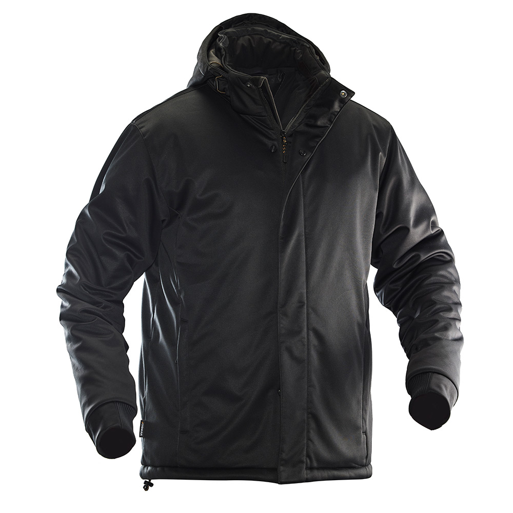 1040 Vinterjacka Softshell. Varmfodrad, lätt och skön jacka i softshellkvalitet. Huva med dragsko som är avtagbar med tryckknappar. Blixtlåsförsedda framfickor och nätficka inuti med plats för handskar eller mössa. Blixtlås i nedre del av ryggen för brodyr/tryck. Quiltat vadderat foder i kropp (140 g/m2) och ärm (120 g/m2), microfleece över axlar och del av ryggen. Funktionsnät i mitten rygg för god fukttransport. Jackan är reglerbar nedtill med dragsko. Diskret reflexpiping på ryggen ger bättre synbarhet. Blixtlås och vindslå med tryckknappar fram. Mudd i ärmavslut, varav halva av ribb kvalitet och halva i tyg. Vattenpelare: 3000 mm. Andasfunktion: 1000 g/m² 24h. Smuts- och vattenavvisande impregnering.