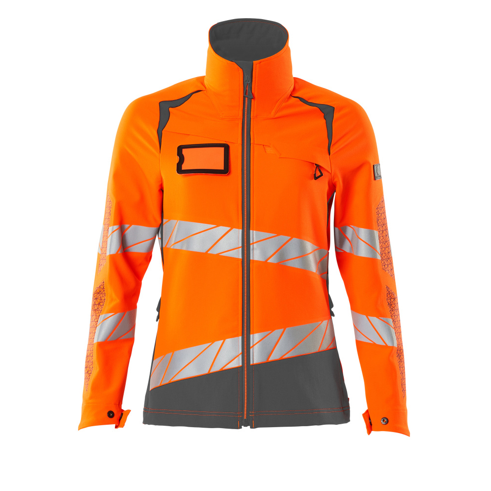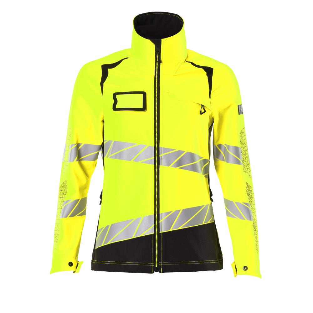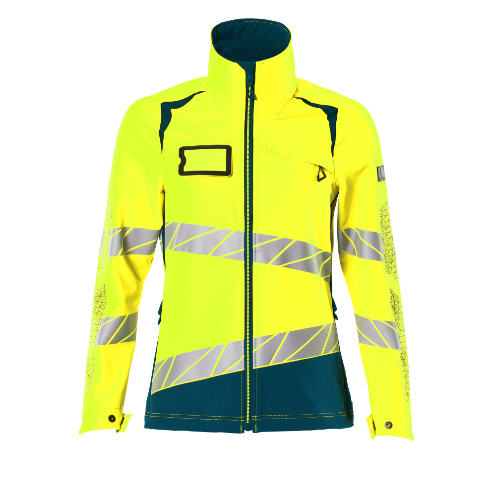 Lady passform. Fluorescerande med sneda tvärgående reflexer. Har en vattenavvisande yta. Ultimate stretchtyg med låg vikt och bra slitstyrka. Hög krage. Tvåfärgat. Stängning med blixtlås och invändigt vindfång. Förberedd för montering av ID-kort. Framfickor med blixtlås. Innerfickor. Resår i sidorna och nederkanten. Resår vid handleden. Ventilation under ärmarna. Med tryckeffekter.