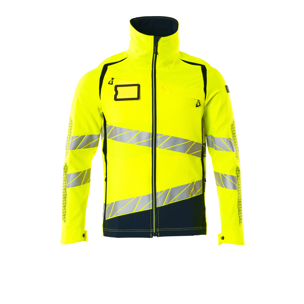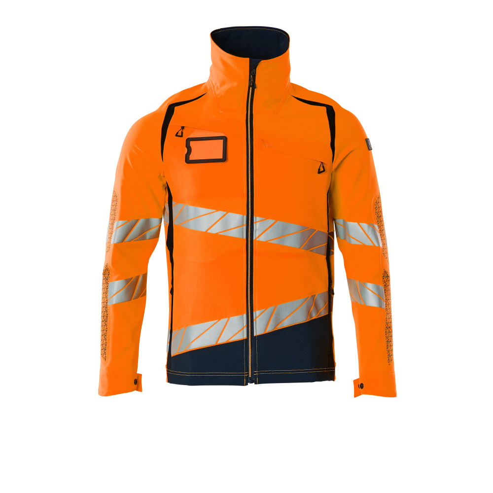 Fluorescerande med sneda tvärgående reflexer. Har en vattenavvisande yta. Ultimate stretchtyg med låg vikt och bra slitstyrka. Hög krage. Tvåfärgat. Stängning med blixtlås och invändigt vindfång. Förberedd för montering av ID-kort. Bröstficka med blixtlås. Framfickor med blixtlås. Innerfickor. Resår i sidorna och nederkanten. Resår vid handleden. Ventilation under ärmarna. Med tryckeffekter.