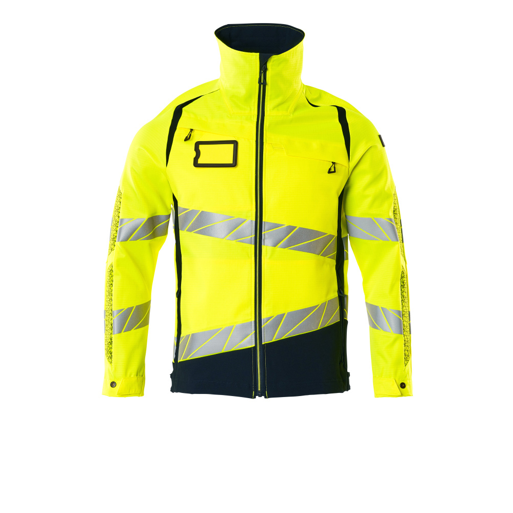 Fluorescerande med sneda tvärgående reflexer. Delar av produkten är av stretchtyg. Kombination av lättviktigt tyg kvalitet 236 och ULTIMATE STRETCH kvalitet 511. Tvåfärgat. Hög krage. Stängning med blixtlås och invändigt vindfång. D-ring. Bröstficka med blixtlås. Framfickor med blixtlås. Innerfickor. Resår i sidorna och nederkanten. Resår vid handleden. Med tryckeffekter.