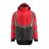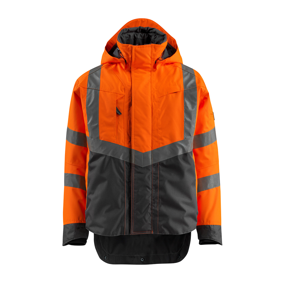 Fluorescerande med lodräta och sneda tvärgående reflexer. Tvåfärgat. Andas, vind- och vattentät. Sömmarna är tejpade. Foder i nätmaterial. Huvan är löstagbar, fodrad och har justerbart elastiskt snöre så att den kan passa utanpå en hjälm. Reglerbar metalltråd i båda sidorna av huvan. Nät med ventilation under ärmarna - öppnas med blixtlås. Hög krage. Innerkrage av resår. Vattentät pennficka på ärmen. Stängning med blixtlås och vindskydd med tryckknappar. Innerfickor med blixtlås under vindflik – den ena är särskilt utformad för telefoner, med hål till kabel och headset och öglor för att hålla kabeln på plats. Ficka med blixtlås under vindflik med plats för en 7-tums surfplatta. Extra tyg nederst på ryggen kan vikas ned med knappar och ge extra längd baktill och därmed extra skydd mot väder och vind. Bröstficka med blixtlås. D-ring. Ergonomiskt utformade ärmar ger god rörelsefrihet. Ribbvirkat vid handleden sluter åt bra och håller ute kylan. Manschetter med CORDURA®-förstärkning och knappknäppning. Framfickor med blixtlås.