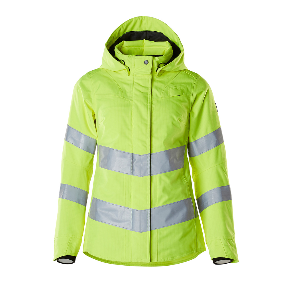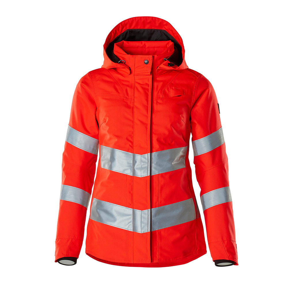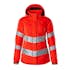 Lady passform. Fluorescerande med sneda tvärgående reflexer. Enfärgade. Andas, vind- och vattentät. Sömmarna är tejpade. Vadderat. Quiltfoder i ärmarna. Hög krage med resår på insidan. Huvan är avtagbar, fodret har justerbart resårsnöre. Reglerbar metalltråd i båda sidorna av huvan. Stängning med blixtlås och vindskydd med tryckknappar. Fickor med blixtlås och vindfång. Ficka med blixtlås under vindflik med plats för en 9,4-tums surfplatta. D-ring. Ergonomiskt utformade ärmar ger god rörelsefrihet. Framfickor med blixtlås. Invändig snörning mitt på höften. Blixtlås nederst på ryggen, invändigt, för användning vid tryck/broderi. Ryggen är förlängd. Ribbstickning (dold i vindskyddet) och tryckknappar vid handleden.