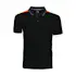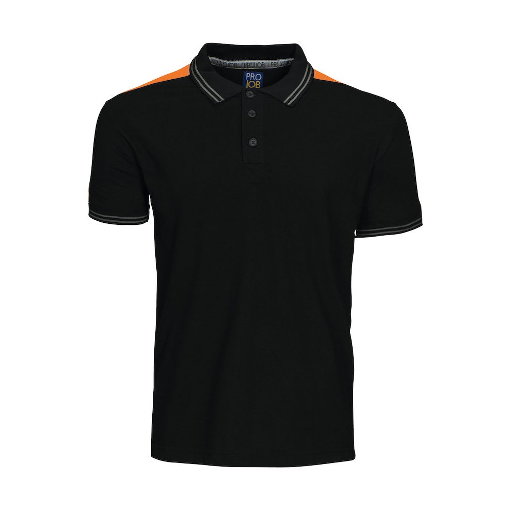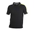Pikétröja med kort ärm. Ribbstickad krage och muddar. Knappslå med tre knappar och slits i sidorna. Fluorescerande tyg på axlarna.