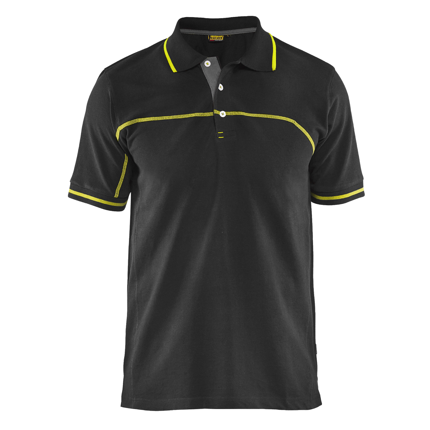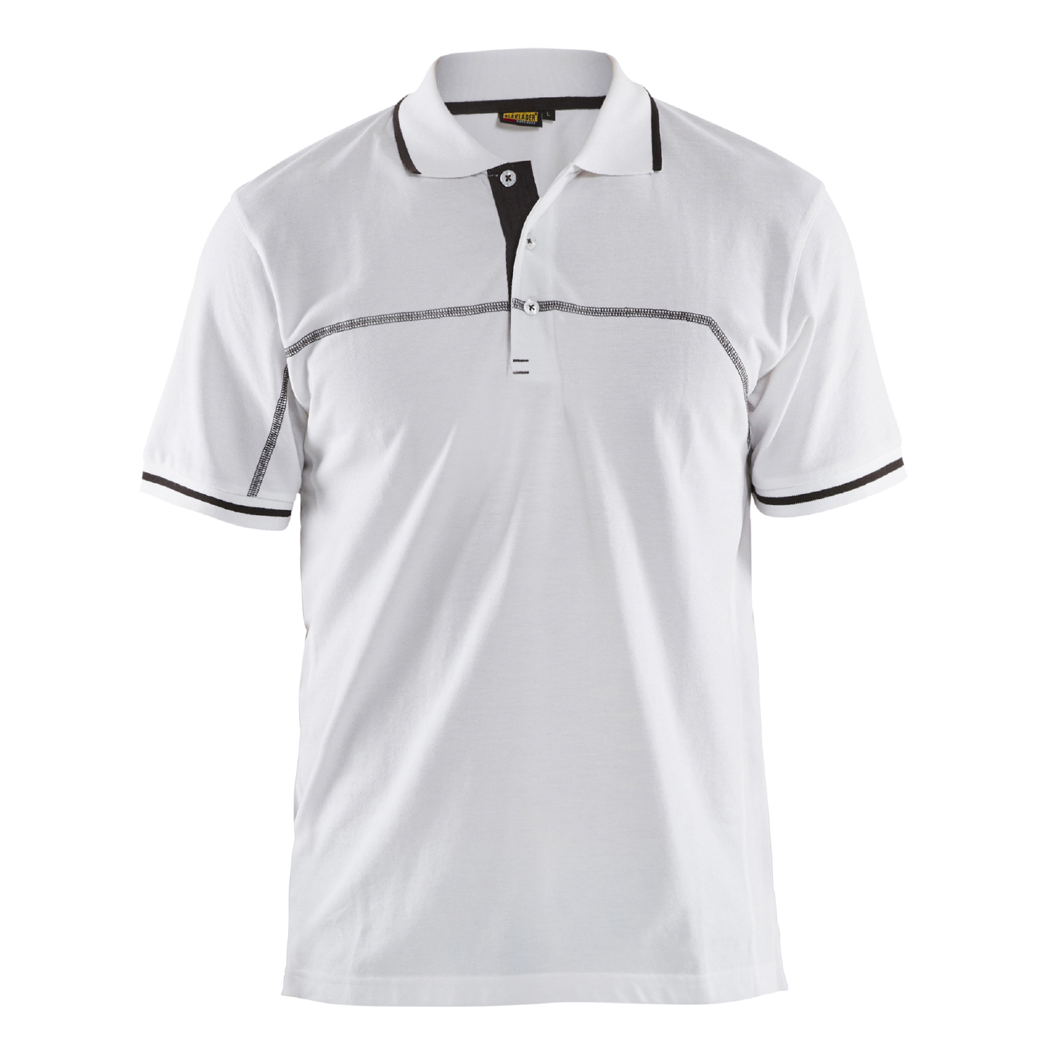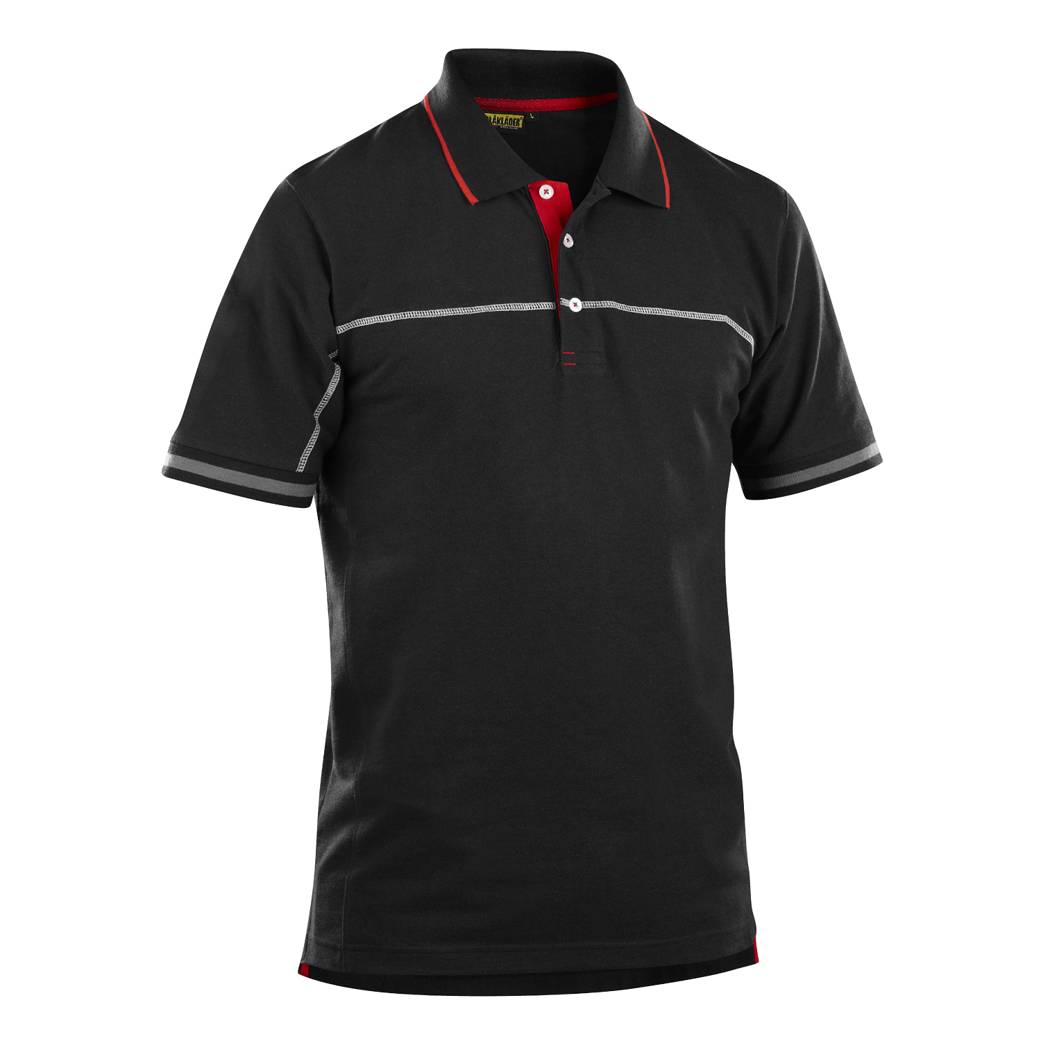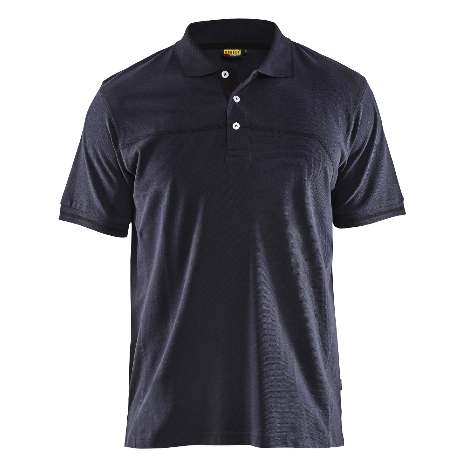 Pikétröja från Blåkläder som är förstärkt i axel- och nacksöm. Tröjan har halsöppning med knappar och med slits i sida.