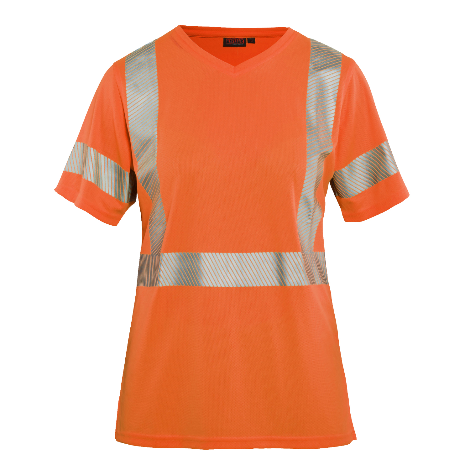 Varsel-t-shirt i dammodell från Blåkläder som är tillverkad i fukttransporterande material med UV-skydd. Tröjan har 50 mm breda, skurna, transferreflexer med stretchegenskaper för optimal rörelseförmåga.
