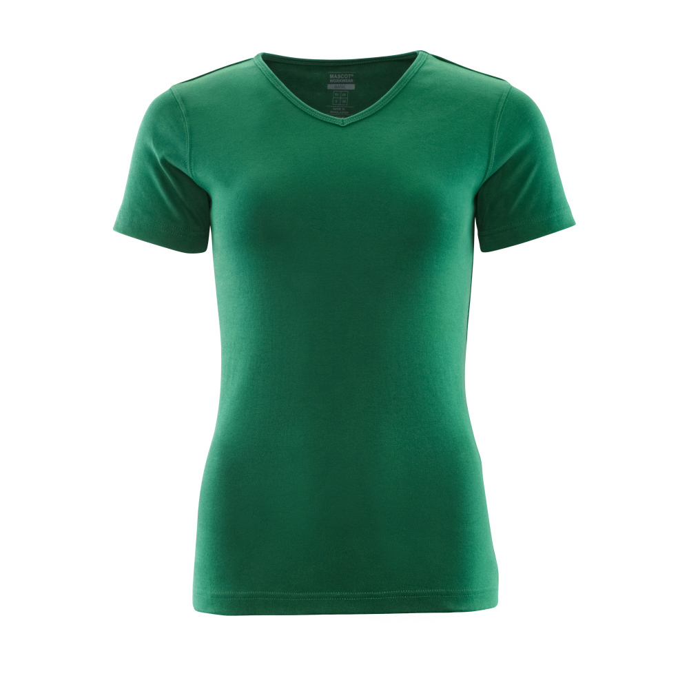 Lady passform. V-hals. Ribbstickning i halsen. Nackband.