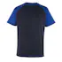 Tvåfärgat. Kammad bomull. Kraftig kvalitet. Förkrympt. Rund hals. Ribbstickning i halsen. Nackband. Slits i sidorna. Ryggen är förlängd. Kontrastsömmar.