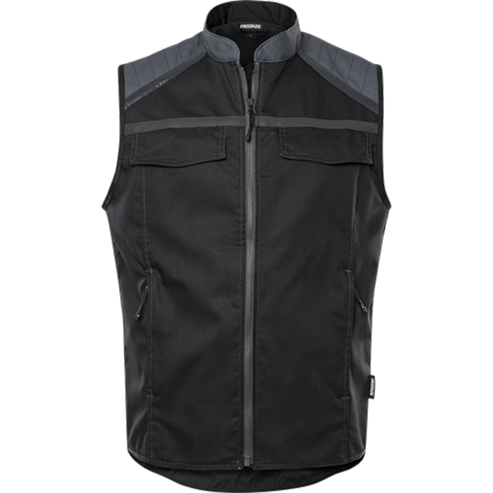 Väst 5555 STFP. Mekanisk stretch / Mörkgrå reflexdetaljer / Ståkrage / Lång dragkedja fram / 2 bröstfickor med lock och knapp / D-ring under ena bröstfickan / Innerficka med knapp / 2 framfickor med dragkedja / Elastisk bandkantning i ärmringning och nederkant / Förlängd rygg / Testad för industritvätt enligt ISO 15797 / OEKO-TEX®-certifierad / Kan förädlas med RFID-chip.