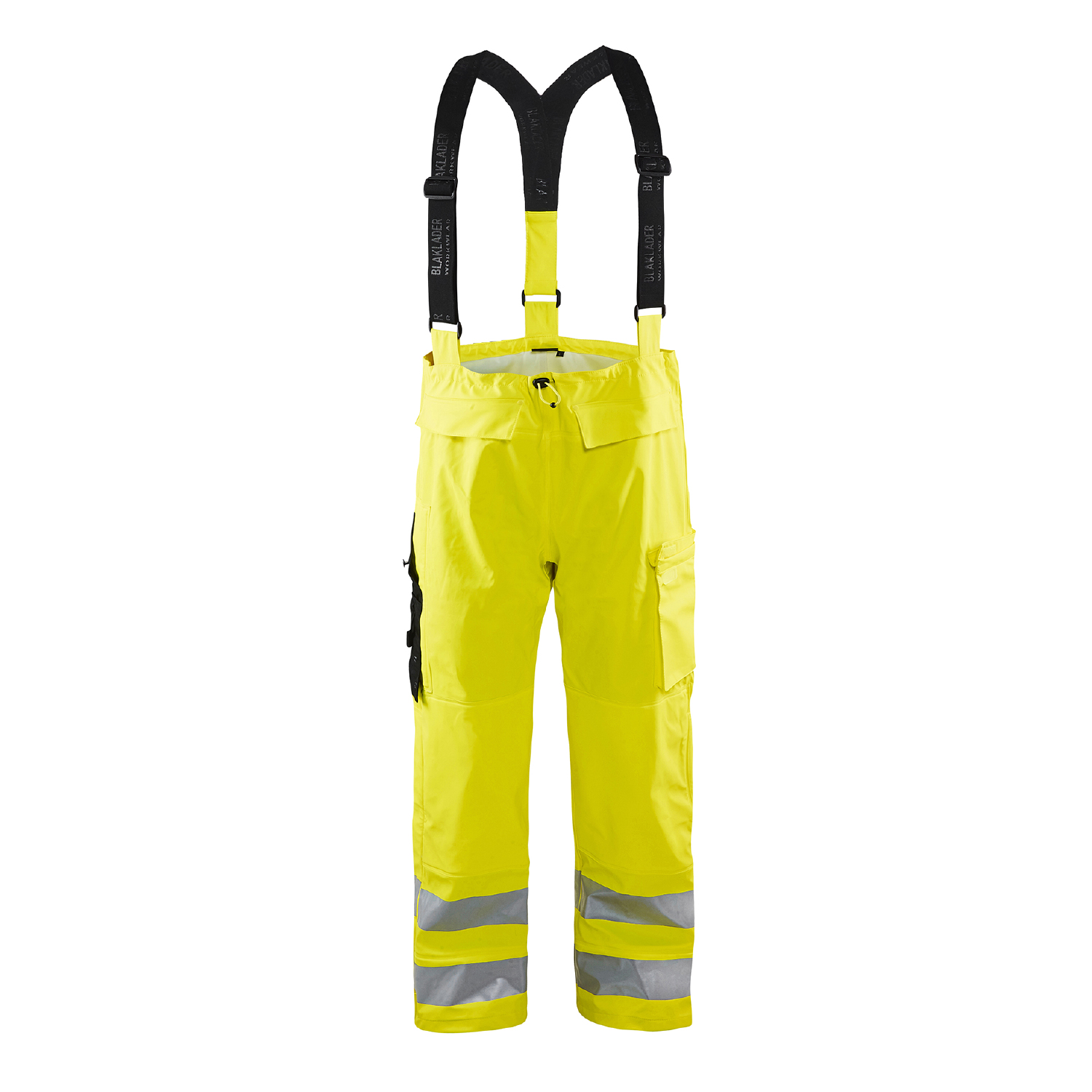 Regnbyxa från Blåkläder i varsel som är designad för tuffa arbetsuppgifter i extrema väderförhållanden. Tillverkad i slitstarkt och kraftigt material men är ändå smidig och bekväm att bära utanpå de ordinarie arbetskläderna. Byxan har resår baktill och justerbara benavslut med knäppning gör det enkelt att dra av och på byxorna utanpå stövlarna. Förstärkningar på knä och i benens nederkant för extra hållbarhet.
