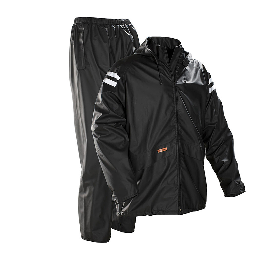Set med jacka och byxa! Trikåmaterialet är riv- och slitstarkt med lång livslängd och ger bra rörlighet genom sin stretchfunktion. Sydda och svetsade sömmar. Det mjuka materialet behåller också sin rörlighet även när det är kallt. Certifierat enligt EU-normen EN 343, vilket innebär att det är godkänt enligt EU:s regler för regnplagg. Avtagbar huva med tryckknappar. Ärmslut med kardborre. Framfickor med lock. Justerbar resårsnodd i nederkant. Reflex på axlar och nacke. Byxan harresårband i midjan och ficköppningar fram med lock, som gör det lätt att komma åt fickor innanför.