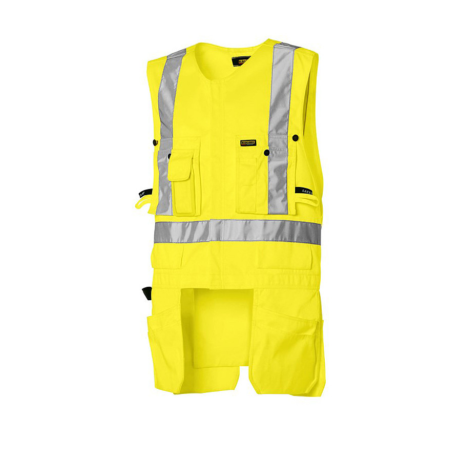 Skyddsväst med hög synbarhet som håller dina viktigaste verktyg inom räckhåll. Öppning i rygg för säkerhetssele. Reflexband runt om så att du syns från alla håll. Certifierad enligt EN471/EN ISO 20471, klass 2 skyddskläder med hög synbarhet.