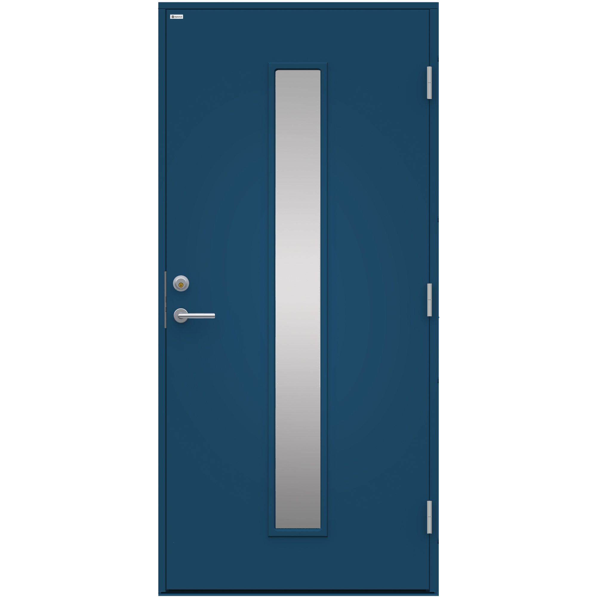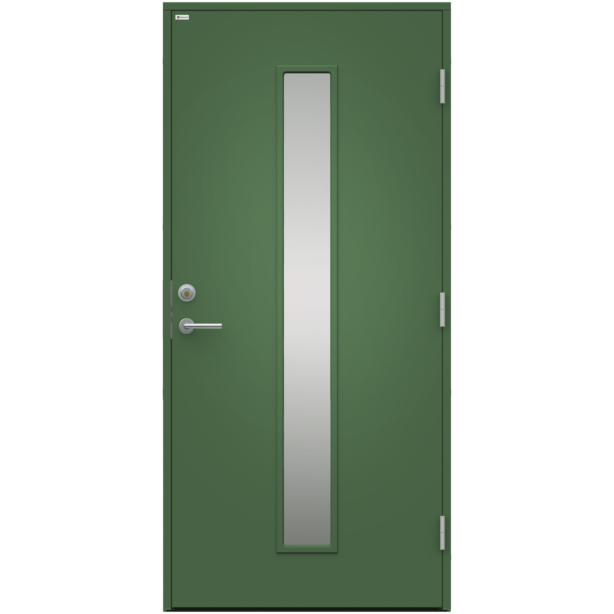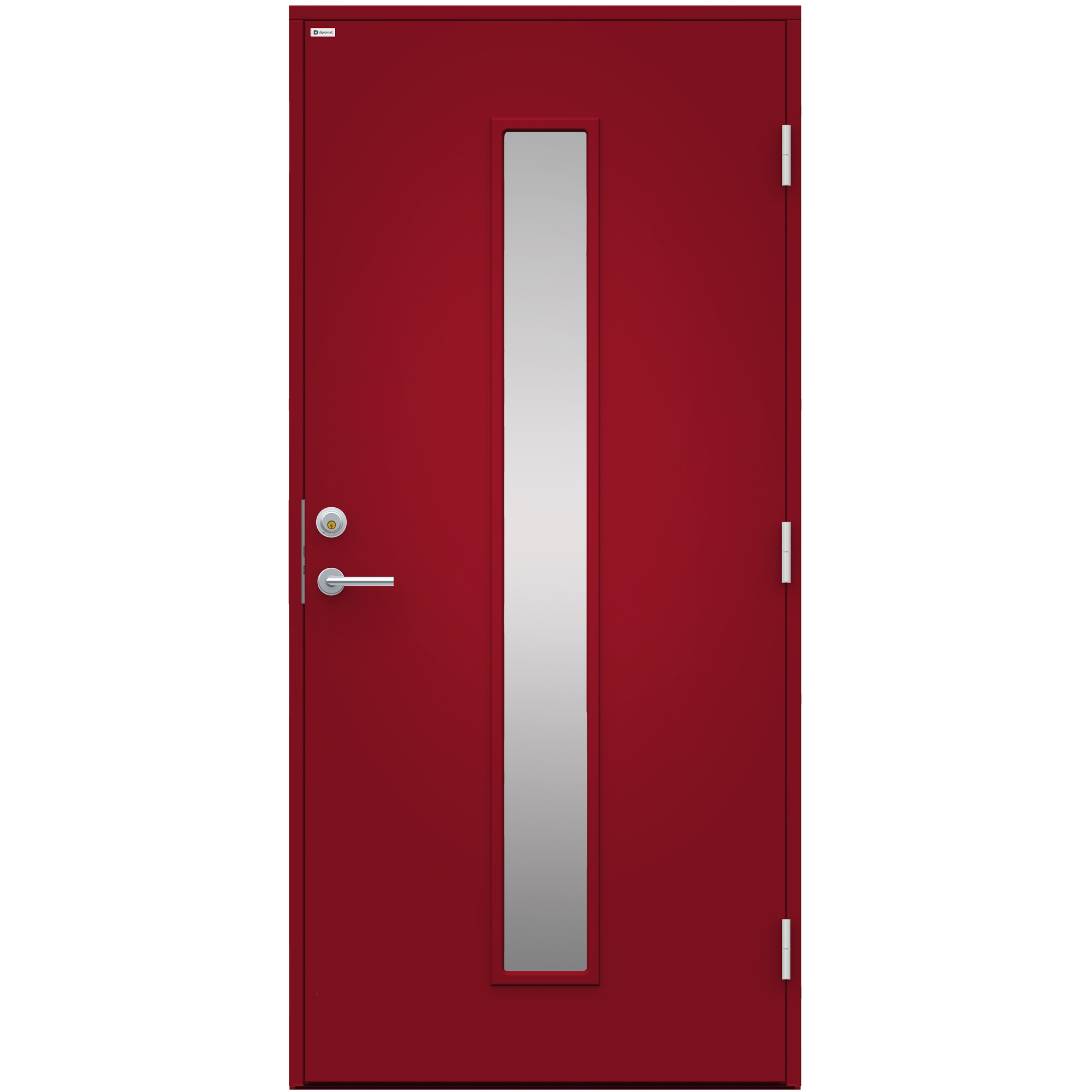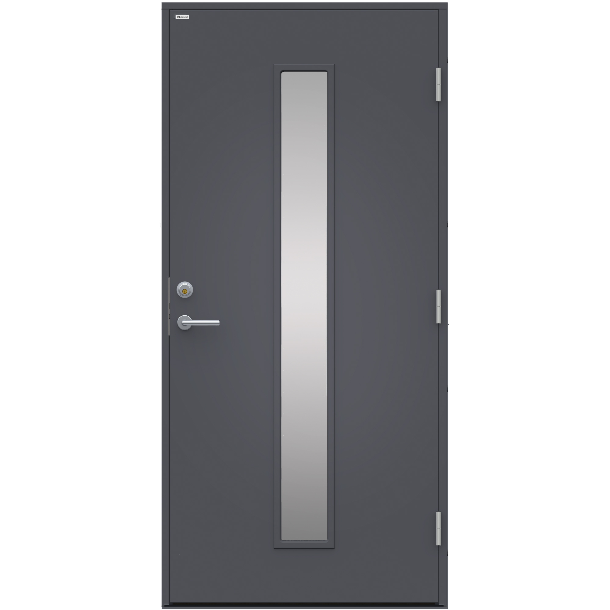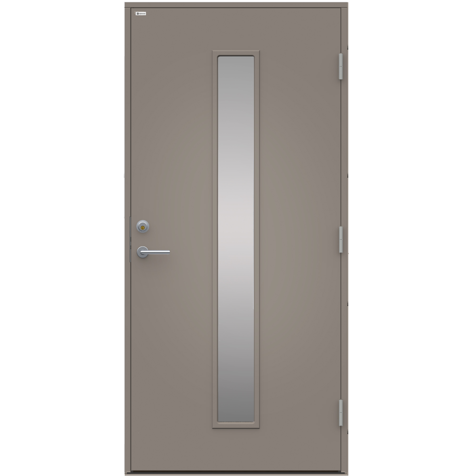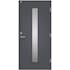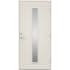 Ytterdörr i modern stil med slät yta och ett centrerat, stående klarglas.