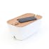 Lägg din grenkontakt i lådan och dra ut sladden genom något av hålen i botten, sätt i dina laddare. När du skall ladda din mobil lägger du den bara på det nedfällda locket och drar sladden genom öppningen.