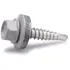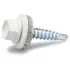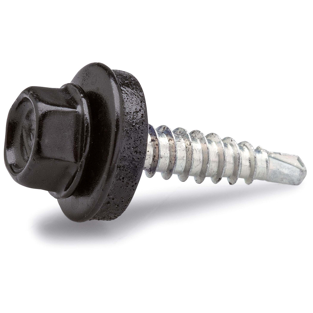 Borrande och gängpressande skruv för utvändig infästning av byggplåt, lackerad i samma färg som byggplåten. Sexkantskalle med fläns. Ledad bricka med tätning av EPDM-gummi. För överlapp. Ytbehandling: Elförzinkad, lackerad. Burk.